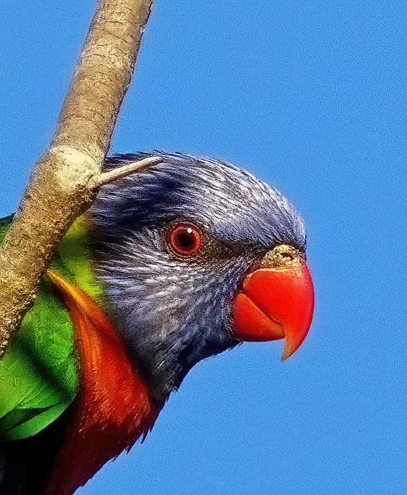 I agree with what Mike has said and done here. The bottlebrush tree, if it had the usual blooms on it, would have added a lot. The harsh light that turned the beautiful bird's midsection into a puddle of shadowed confusion was not your friend. I doubt you could retrieve enough from the shadows to make it work - the retrieved areas would probably be noisy and less saturated and give away the retrieval. I would try, but would not be optimistic about it. But the interesting crop shows you do have a quality photo in there, waiting to be discovered, tack sharp, with beautiful details and colors.