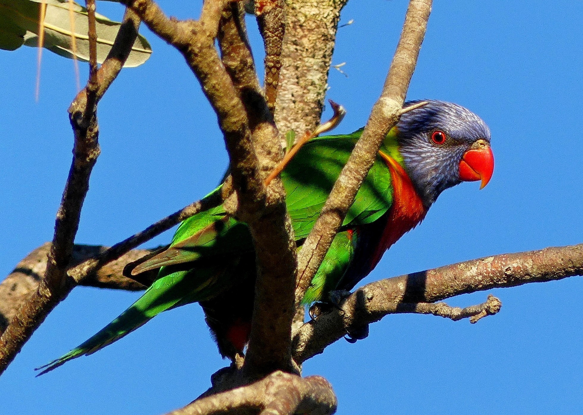 The original shows the lorikeet playing peek-a-boo through the branches, although a bird that coloueful must find it impossible to hide!. The branches are a bit busy, and the leaf top left is a distraction, so I find Mike's suggested crop to be a good idea.