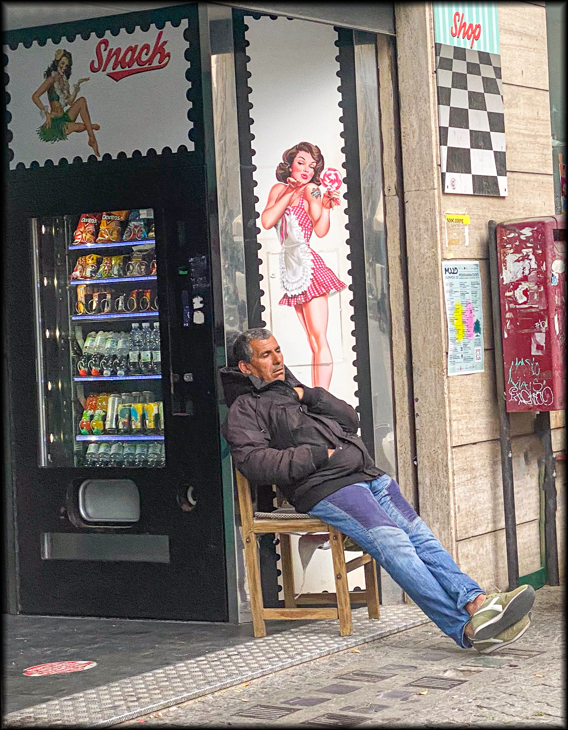 Ha, good one for a quick street shot. One can imagine what this individual is contemplating - snack, drink, girl, better future. Dreams are limitless...