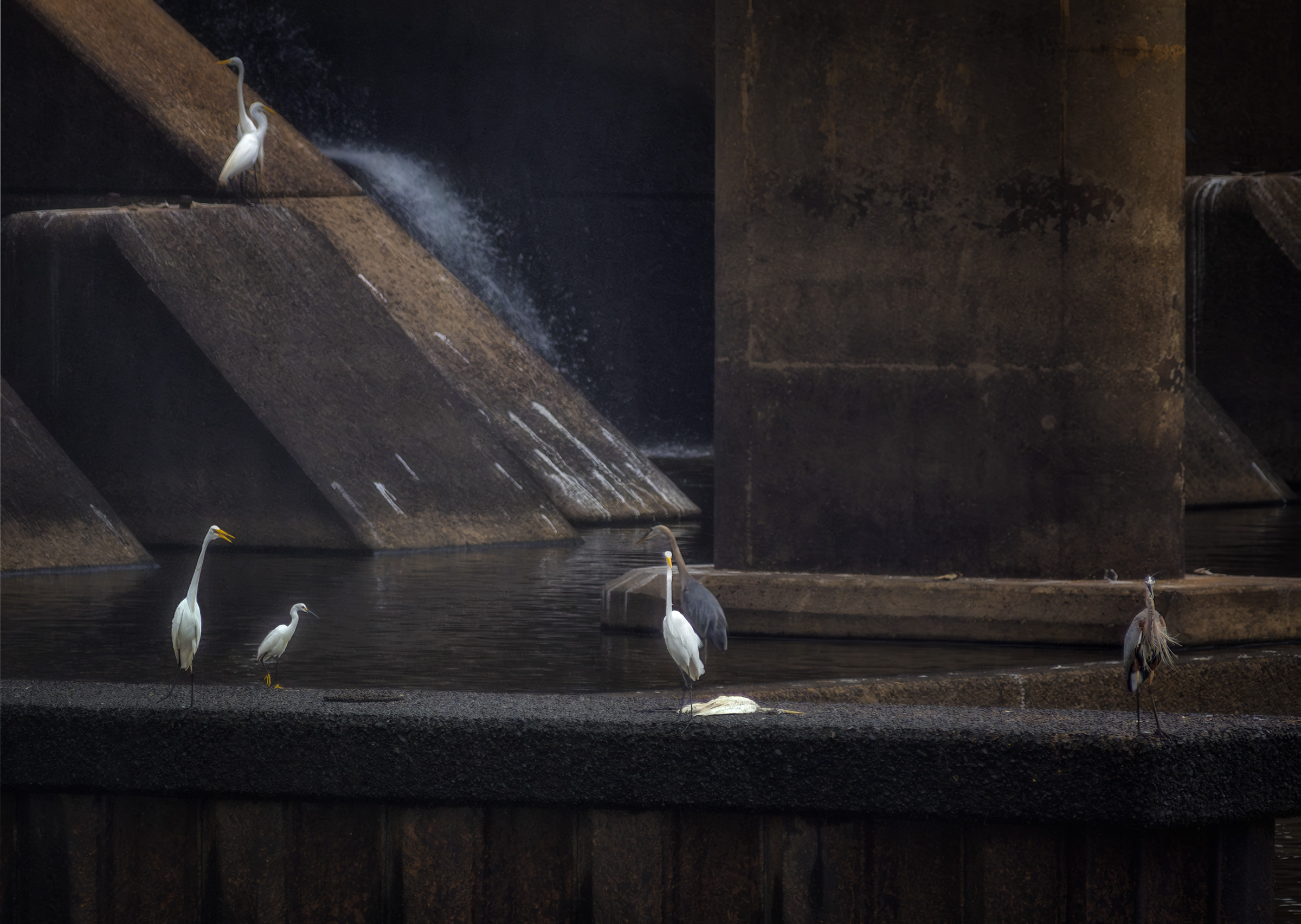 Last weekend I sadly found a departed dam bird who died on his perch. These deaths are usually from birds swallowing a fish with a hook and line in it. I have also seen deaths from diving head-first into the tumultuous rock filled water, but those bodies are usually found on the rip rap lining the river below. This entire week there has been a congregation of blue herons and great and little egrets that has stood around the dead great egret. They are not fishing or fighting or displaying, just congregating. These are very competitive birds who defend their perches aggressively so the behavior is unusual. I could add a flying dam bird in front of the blank post, but apparently, the funeral site is a no-fly zone so I'm undecided.