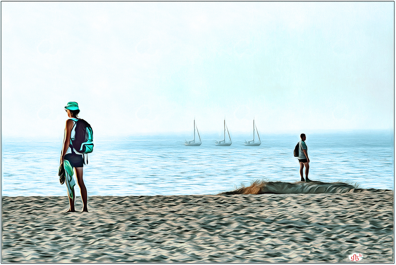 Then I see the identical triplets (sailboats) in precise military formation, which further emphasizes the fanciful nature of the image. I love the aqua-colored details on the stylish and self-confident left side figure vs. the drab attire of the one who doesn't like to draw attention to himself. Each looking out of the frame suggests their reasons for being there are as opposite as their personalities.