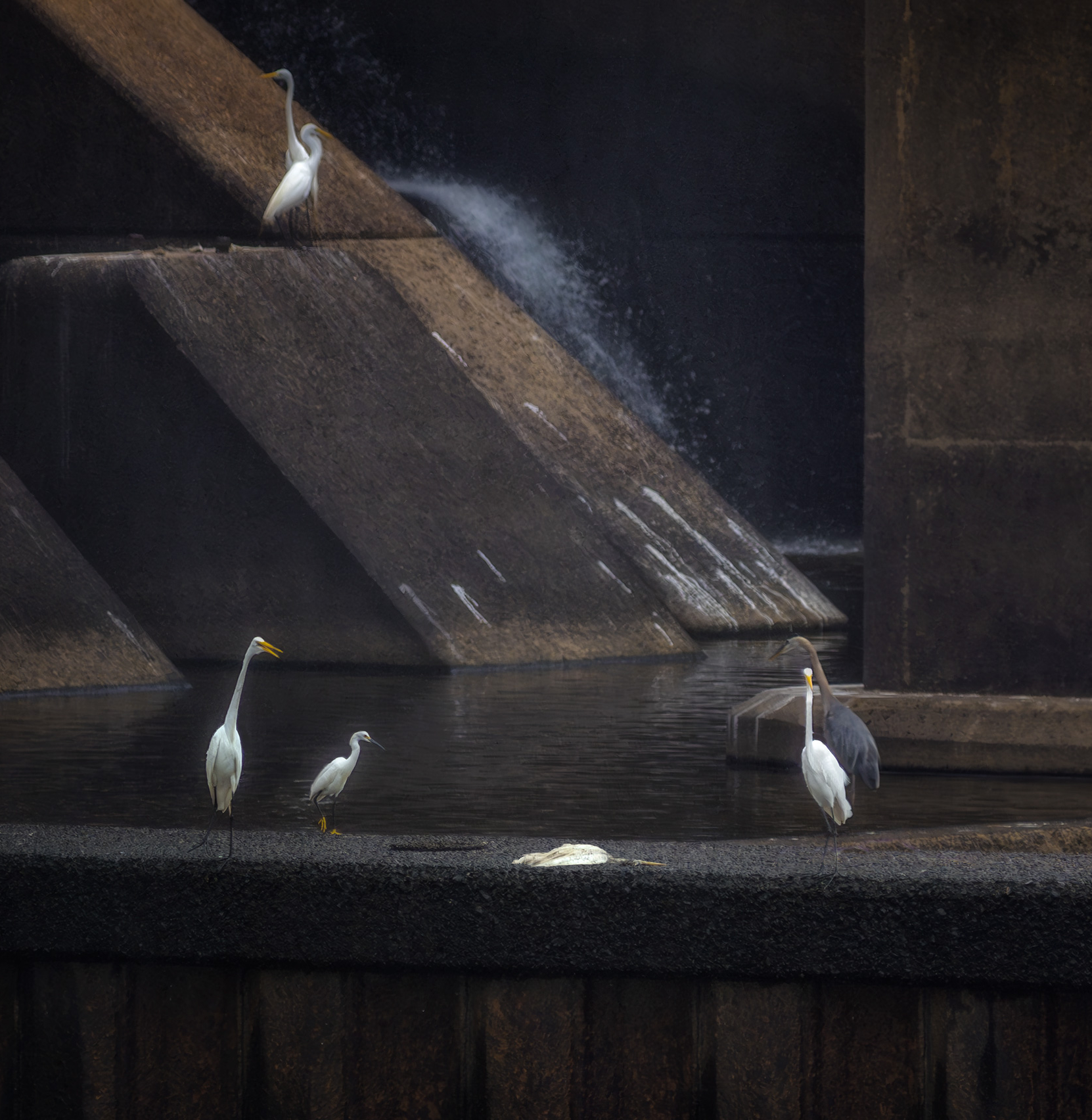 Agreed. As always with the Dam Birds, I see this image as part of the series and it is a very different moment. Sometimes the dam is full of movement, boiling waters and stage spotlighting. Not this time. The lighting is dark and the background forms subdued. The pure white birds stand out. Enough of them look towards the fallen bird and that plus the white, mean we cannot miss the death. the attitude of the birds suggests that they feel the moment.