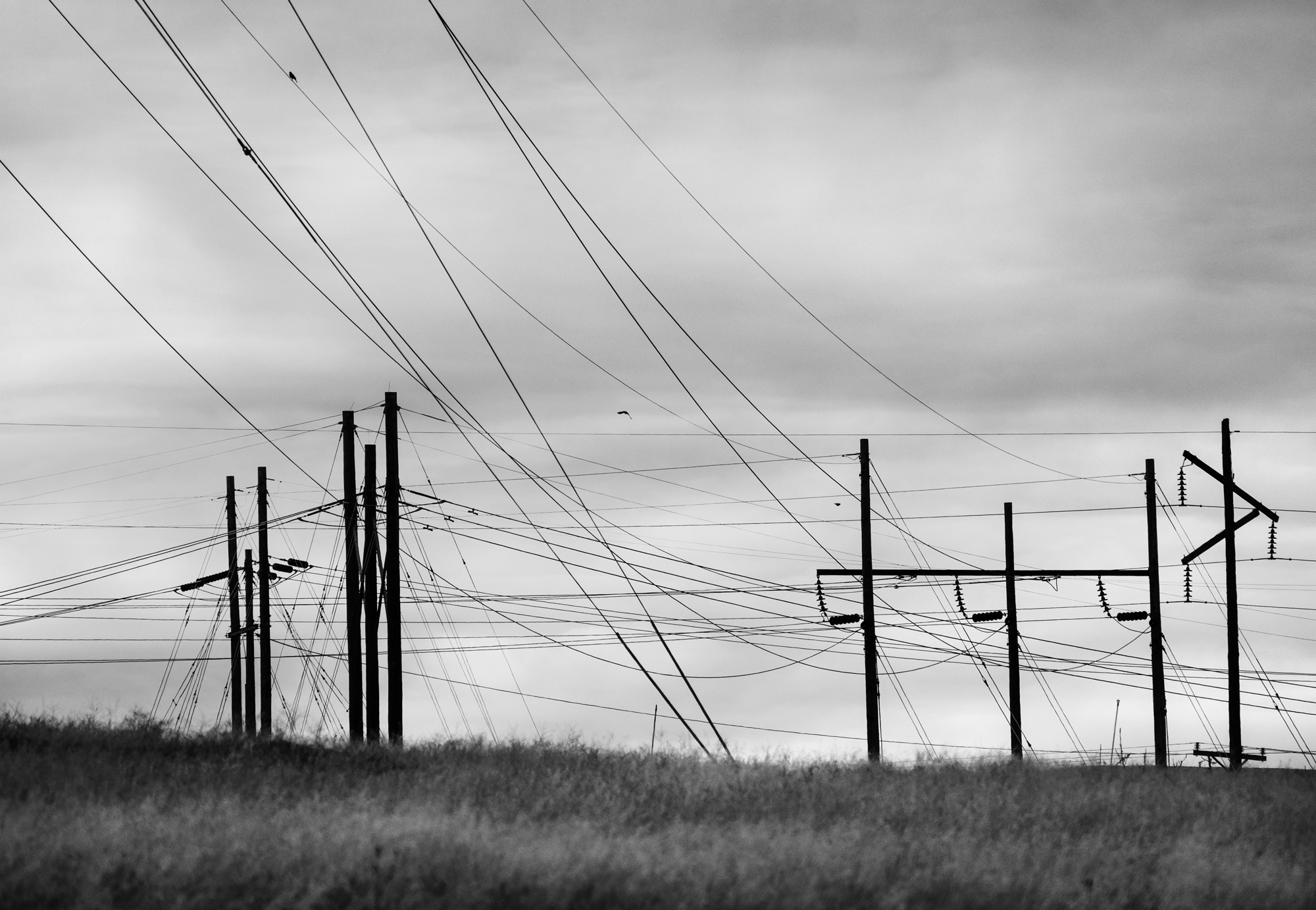 I tried converting this to black and white, and added a different cloud formation just to confirm my awakened thoughts. See attached. I do have some stark b&w graphical (if I understand the term correctly) poles and wires, but those were originally shot against plain blue sky, so there wasn't a "mood" involved. Many thanks!