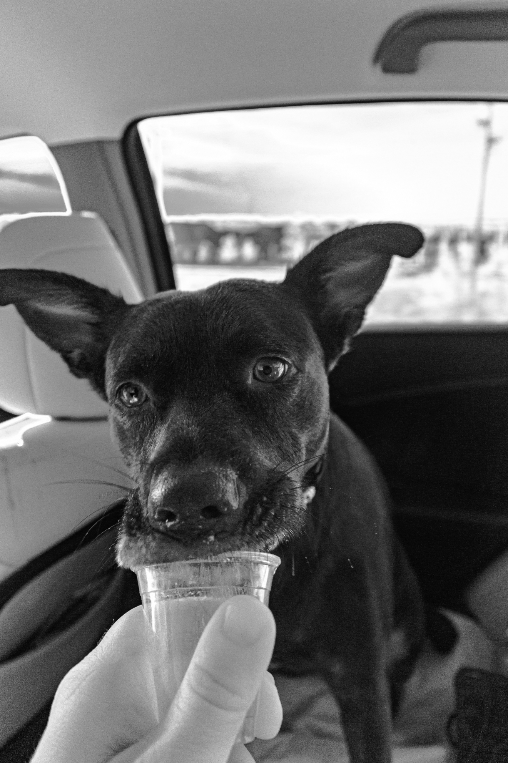 You got me. I'm a dog lover and this shot reels me in.Your angle and lens choice make the hand and cup feel as though they are those of the viewer. It feels as though we are offering the water to the pup. His eyes look directly back at us. Bonding is established. Add in the tilt of the head and the tuenrd down tip of the ear. We have personality. I don't know about y'all but I know that dig and I would get along just fine. It isn't the dog that has done this, it's the little touches that the photographer has caught that have created the bond.