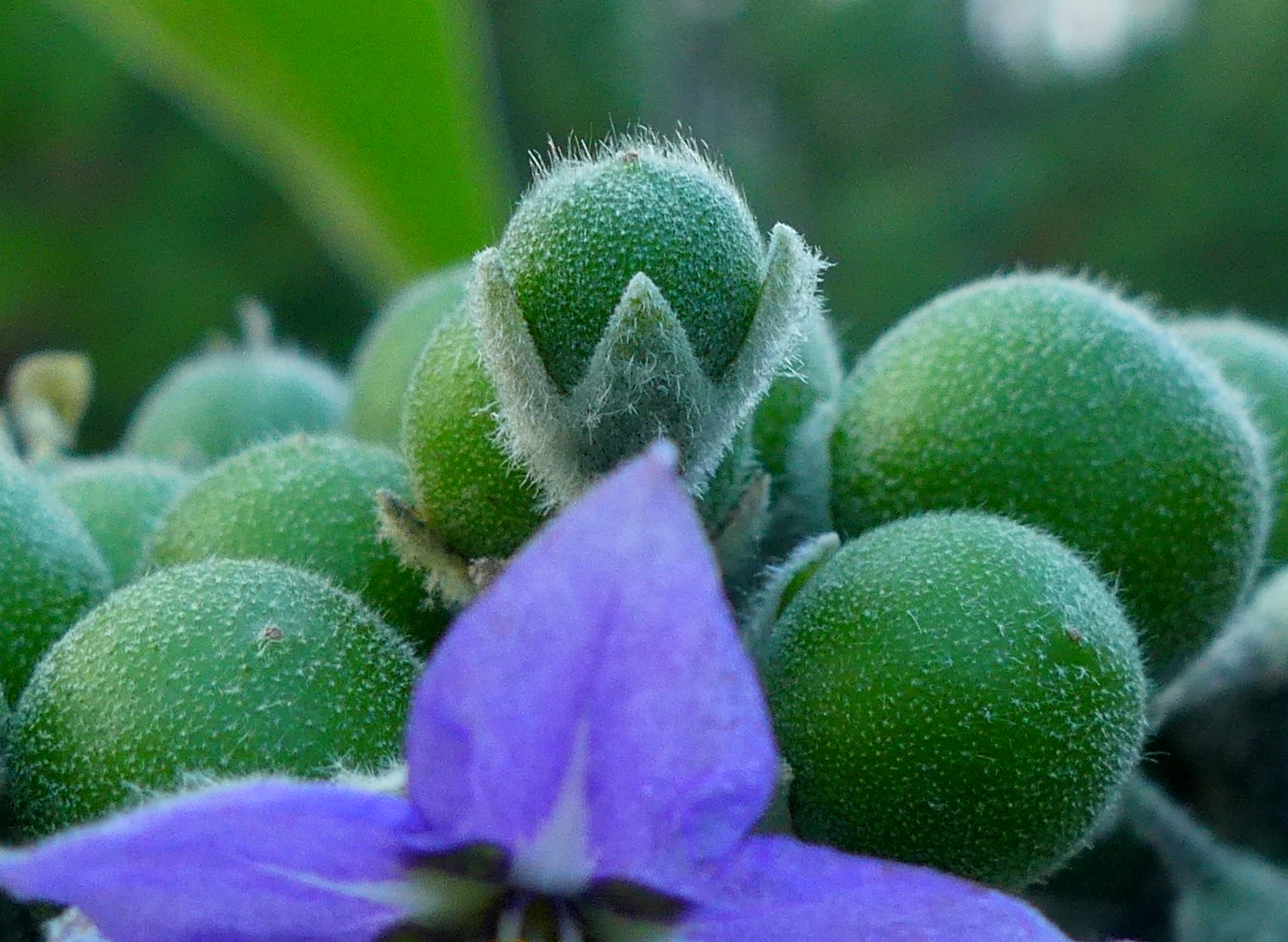 You've given us an unusual composition here. The focus is on the central bud that rises out of a triangular configuration of buds, but the flower itself in the foreground is only partially revealed and is somewhat unfocused. It does have the same triangular configuration as the buds, which is interesting. It is a nice play on focus sharpness, shapes, and color contrast (purple and green are pretty much opposites on the color wheel), and the detail in those buds is great. I'm pretty sure, though, that I'd prefer a more traditional composition with a full sharp view of the flower and the buds nearest to it, or perhaps the reverse angle with the sharp buds against the blurred purple background of the flower. But heck, I'm old and fairly traditional in my tastes, so take that into consideration. Thanks for sharing a creative and different approach to such a subject.