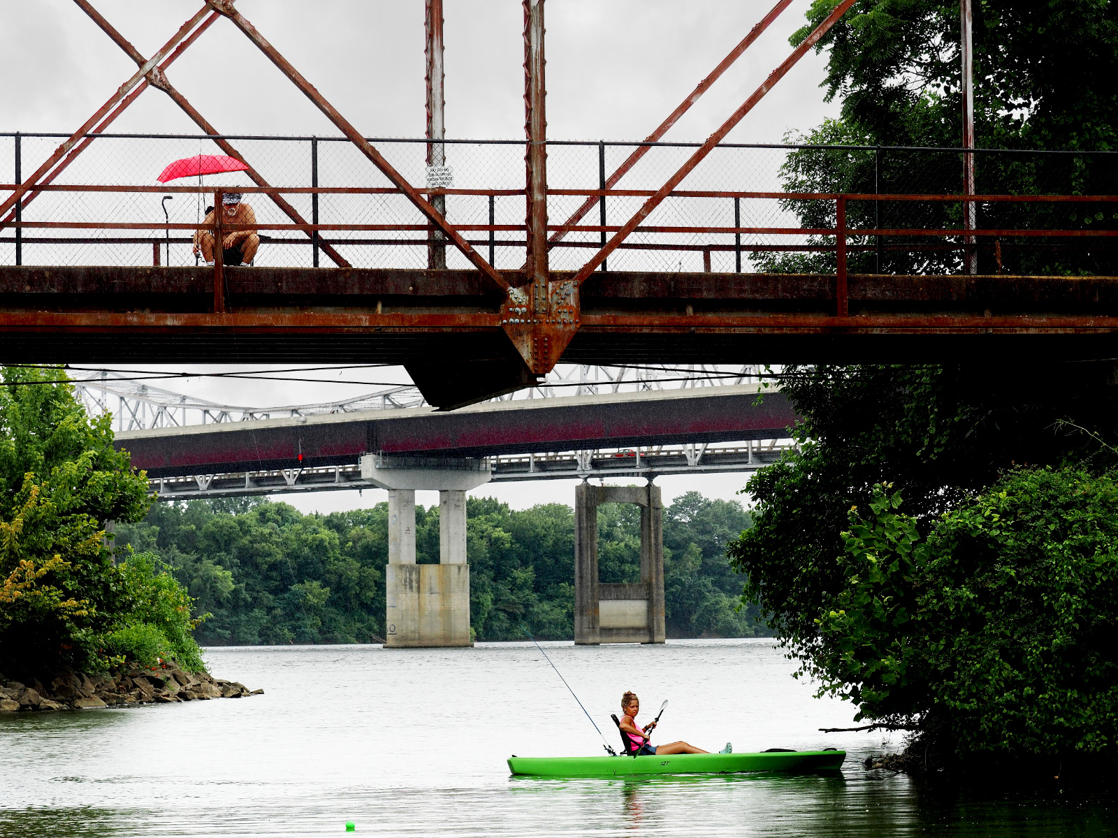 The white-ish sky suits the story better I think. I took a try at what I was thinking of, and it's very subtle so perhaps no one would notice if they didn't look closely, but I added a white-ish sky that has cloud detail and cobbled it in behind the bridges. Adobe sky replacement helped me with this.