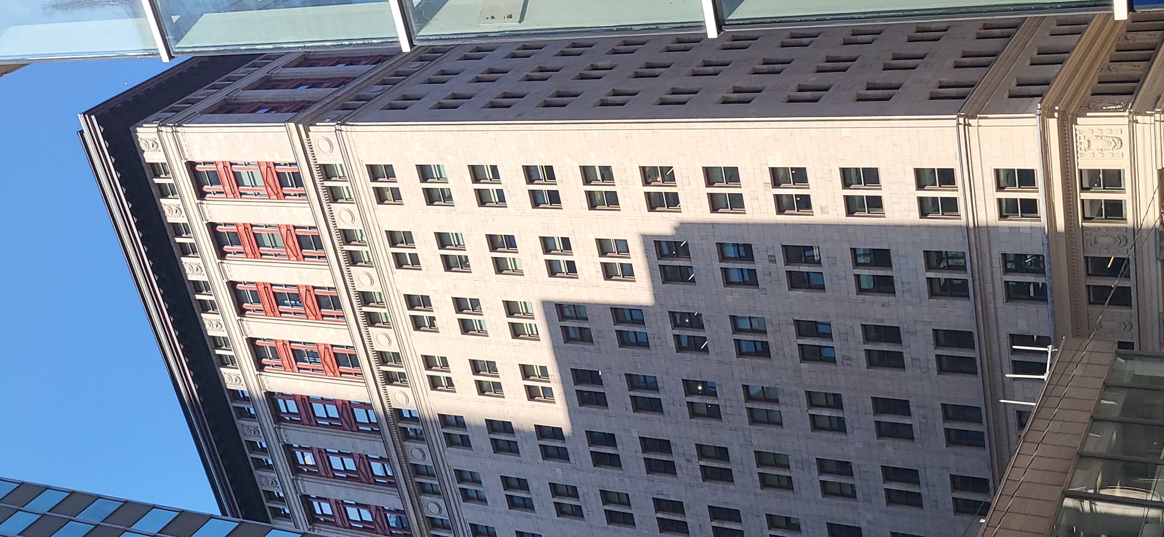 The geometric patterns are the theme, but it is the stepped shadow, which makes such a difference, splitting the facade into more rectangular shapes, and does so without cutting across any of the windows.