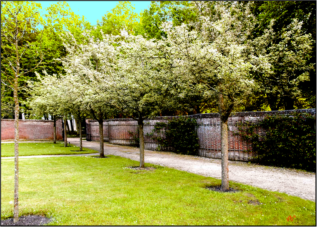 The first shows a delightful wall. It is not only its unusual snaky form, but also the texture and colour of the bricks, which makes it an eye catcher. The surrounding trees and leaves contrast well with its rectangular shapes. The bright green lawn ensures are eyes are lead down the wall to this patch of light.