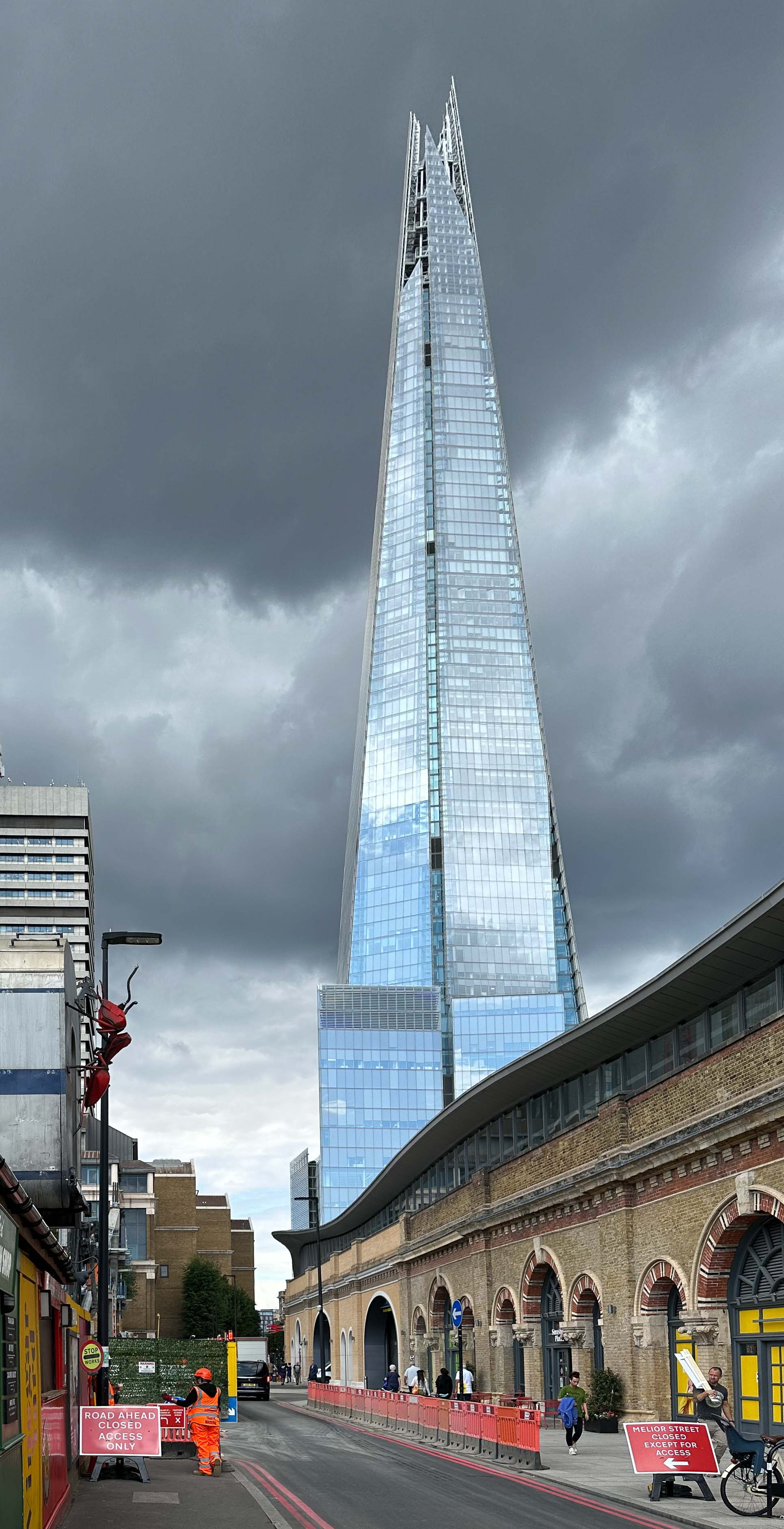 It baffles everyone! It is a sculpture on London Bridge and only a story or two high, but there is no name or explanation for it. The name most commonly given to it is The Spike and the usual explanation refers to the practice lasting centuries (but thankfully no more) of impaling the heads of traitors, rebels and serious criminals on spikes on the old London Bridge. I used a wide angle lens and low viewpoint to make it look higher than The Shard, which is about 20 times higher.
