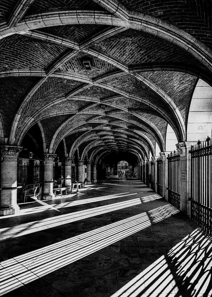 The PP in the first place it's not a solarizing filter as I don't use Nik filters. It is a night shot with a professional treatment to reveal all the details and make it ready for etching on metal. The image is only added to get an impression of the length of the corridor on the ground floor and nothing more. Furthermore, a comparison difficulty is associated with one being Mono and the other being in color.