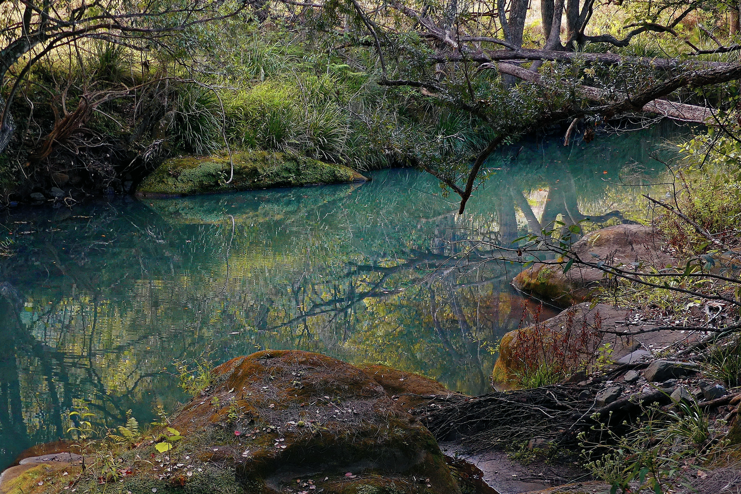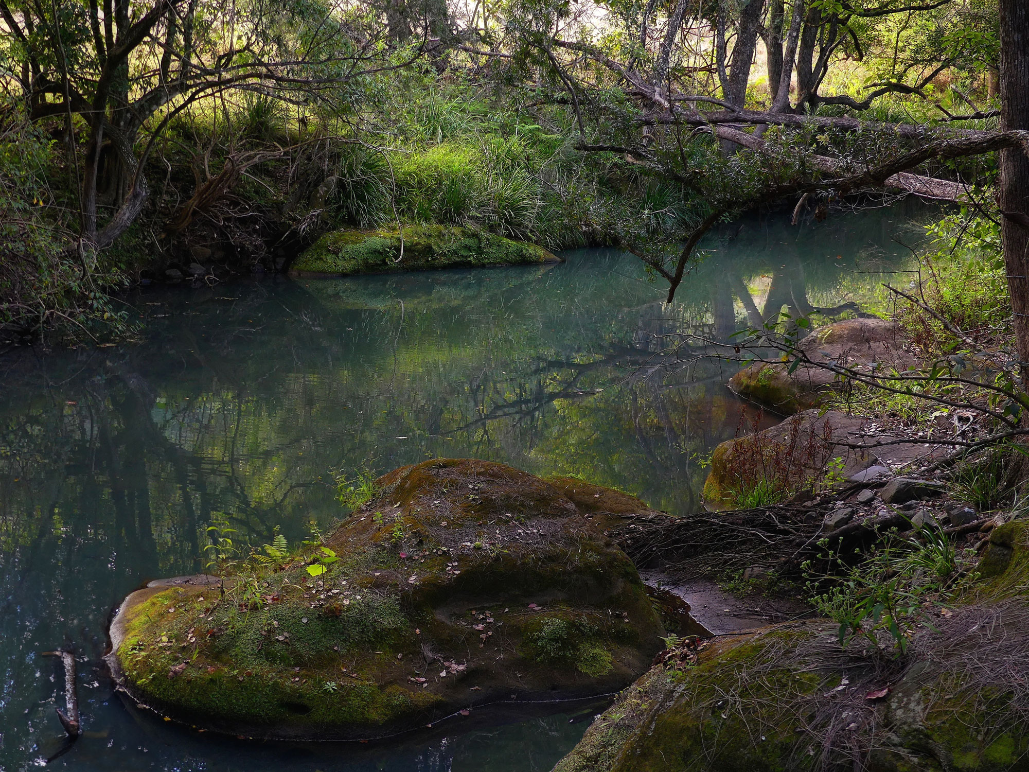 This is a lovely sylvan scene, Aussie forest style. The angles of both shots is engaging, with nice smooth water, gentle light and reflections to work with. I'd be drawn to spend a lot of time with it. It seems that the canopy is thick enough that you could shoot there even when the light is not friendly. You have some overbright spots in the second one that are eye magnets. Both might benefit from some editing. Cropping would remove at least part of that nice rock in the second shot, so I'd try something else. I don't think you mind people tinkering with your pictures, so I experimented with #2 using the new Photoshop Beta to fill in the bright spots and preserve the entire rock. Beta did a fair job on the leftmost spot, and threw a broken limb in the water to make it realistic. It failed on the brighter spot so I did that one by hand using a sample from the far shore. (You would probably never guess that I like playing with pictures).