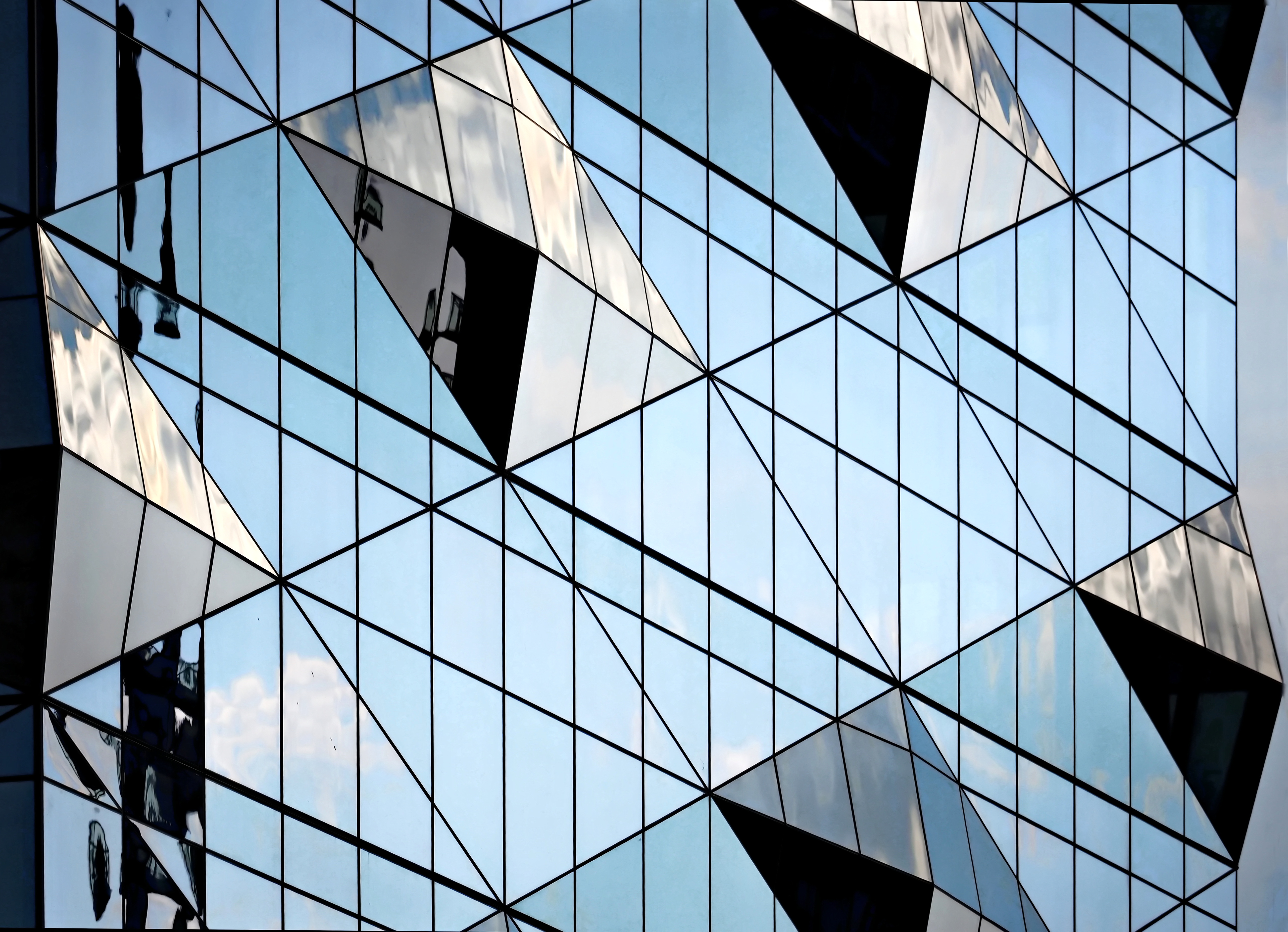 The third is a little overwhelming for all that is going on, though it's good to see what you were working with. Of the first two, I can't choose which I like better. The close-up has intriguing cloud details and full blacks in the individual triangles. The more distant side view is awesome with its inclusion of the sky that caused those great reflections and the contrast of the shaded side of the building. What a photo op!