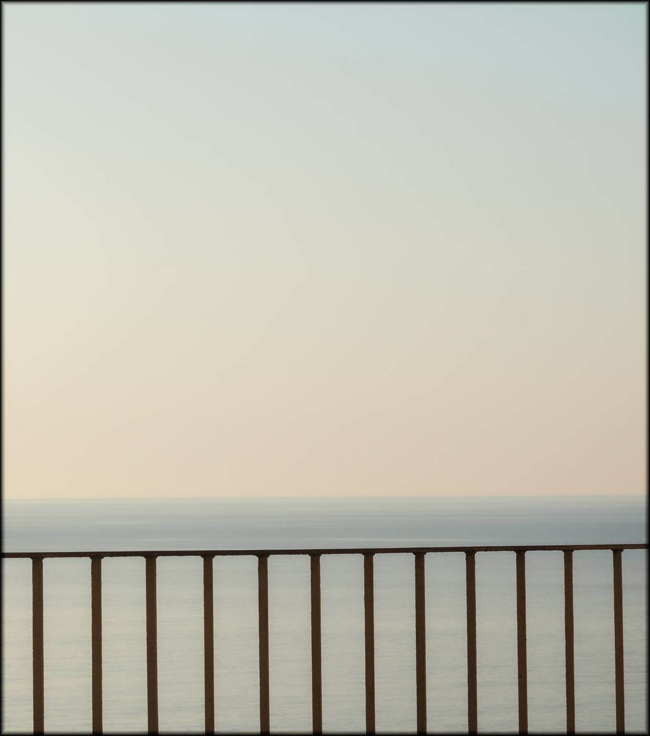 Totally agree. Will just add that the expanse of sea and sky, almost featureless triggers a sense of peacefulness and freedom and also a desire to find out what is beyond the horizon. The railings hold us back, but is that restrictive or protective?
