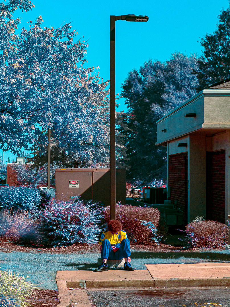 This is a good one, though I am curious about how it looked in its original colors and whether that told a different story. The composition works well - the clownish figure it's its fright wig of a hairdo and the oversized shoes, leant against the light pole playing with his phone, with the Danger/High Voltage sign just back of him. The rectangular building blocks of the composition are lined up quite nicely to form both foreground and background geometry (buildings, sidewalks, road, doorways, lights, hedges, and the big object holding the Danger sign). From a technical perspective, you've avoided the halos that sometimes plague you with your ambitious color conversions. It's an intriguing scene with an enigmatic figure, mixed comedy and mystery. Well spotted and constructed.