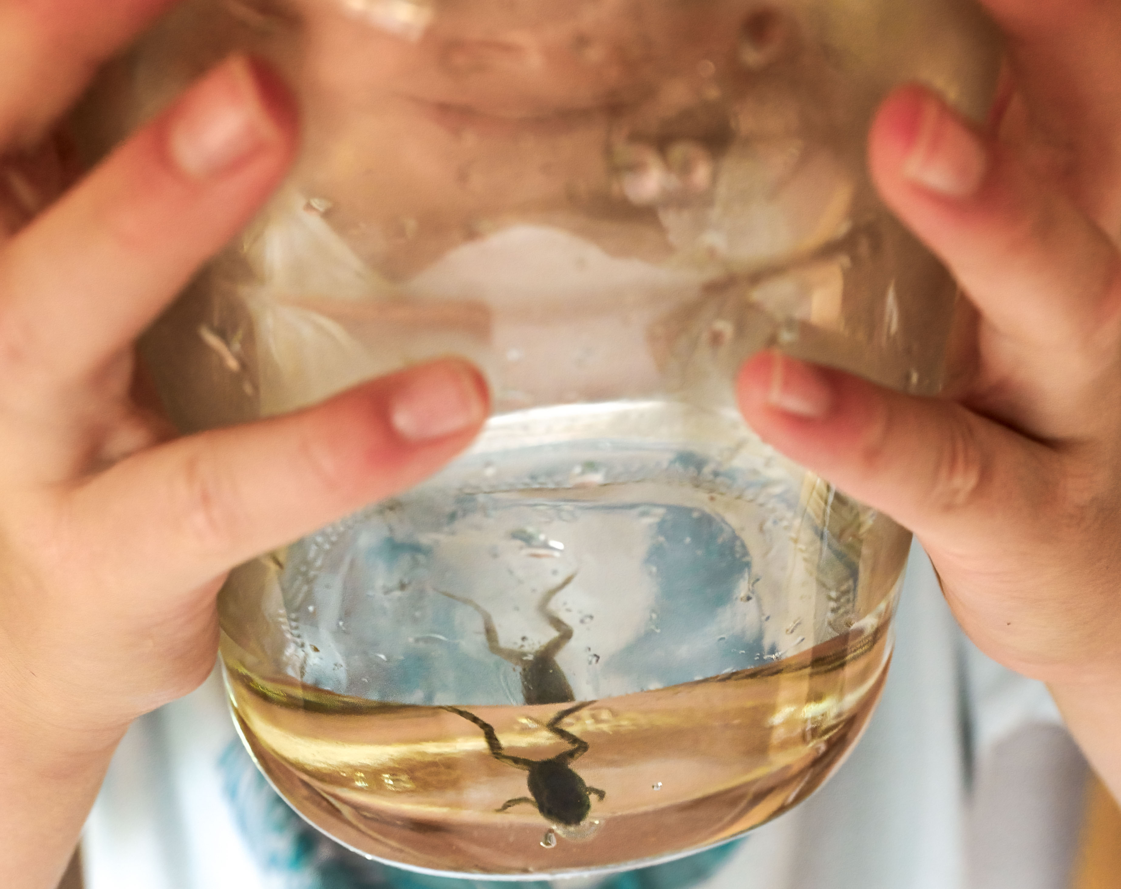 My grand-daughter was determined to catch a baby frog and was looking for a fishing-net. We whistled in the wind and pretended we didn't have one, so she took a fly-swatter as a poor alternative and, amazingly, tempted the frog onto it and into the jar! Luckily, after gentle persuasion, she decided to set the little fellow free again.