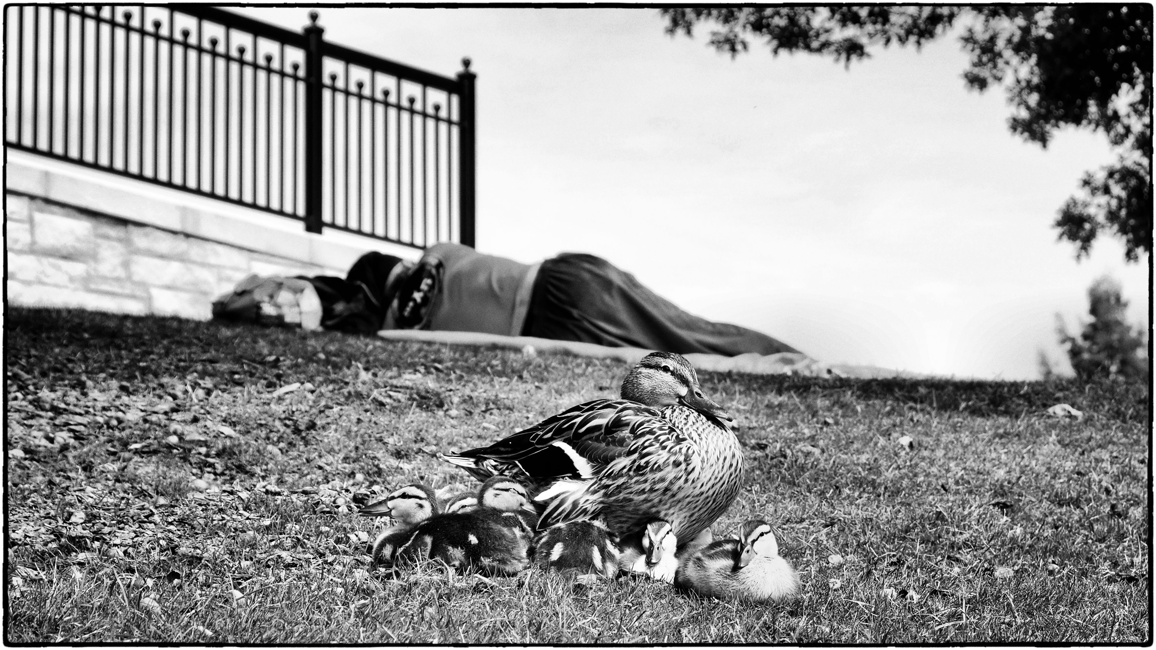 For me, the signs and poles and the tree and the hydrant are all distracting elements. It took my eyes a few seconds to find the guy, his colors are too similar to the trees and poles. I'd love to see a version of this with just the guy and the road and a sense of disappearing.