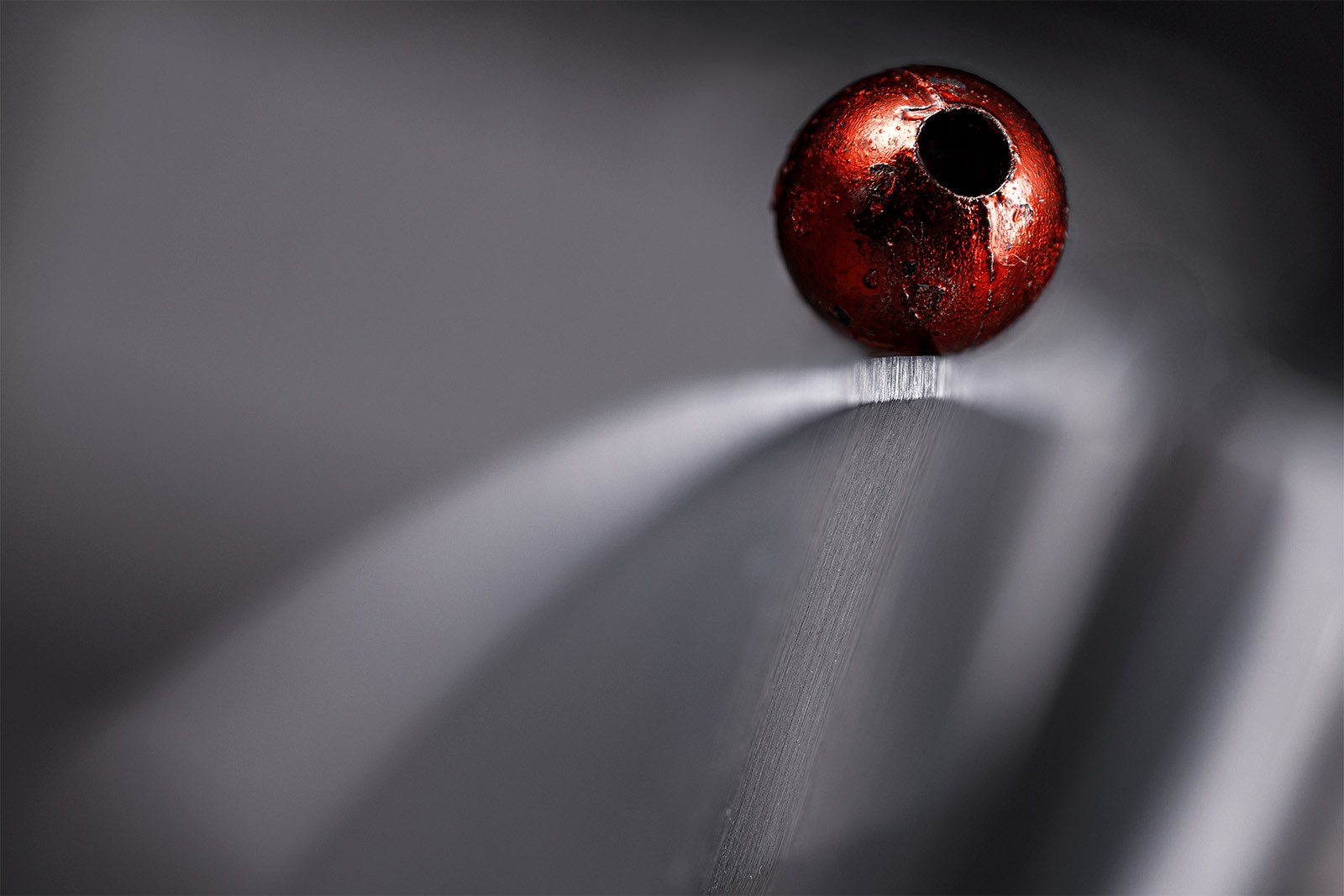 Colour and line. The rich red lifts from the grey tones. Even when blurred, the line on which it rests is distinct and its diagonal gives tension to the balancing act. The sharp edge where the bead? rests has our attention. Many metaphors become possible. A potent image.