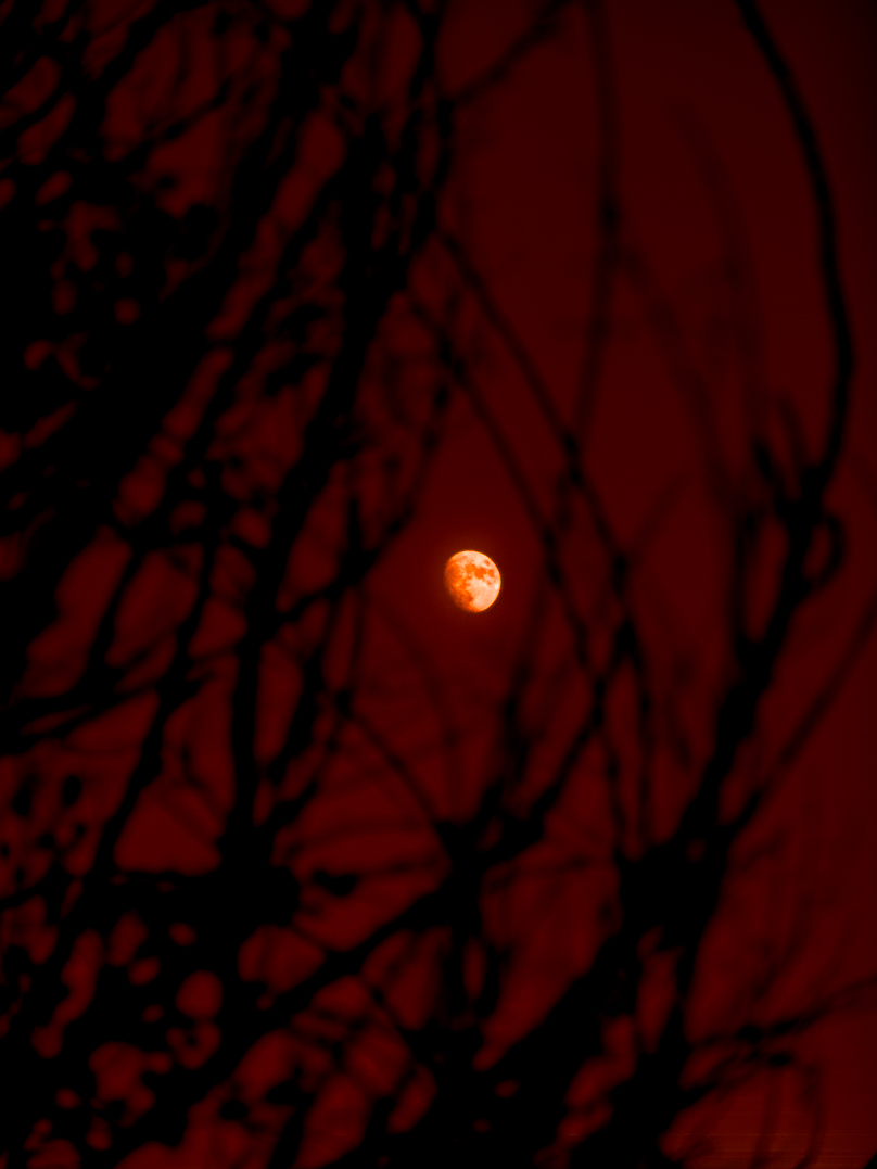I love the lacework look of the foliage over the moon. You have lost a lot of detail in the moon's surface though. Is there some you can bring that back through editing? Shooting moons usually means significantly underexposing from what the camera wants, or even what makes sense to us. I've been told that you need the same settings you'd use for shooting the sun, but that is a bit extreme for me. I do have to go much lower in exposure settings than I would have imagined though, to get those nice craters and mountains to show up. Of course letting the moon go featureless can also be a legitimate approach, taking a more graphic-art type approach. Play with your image and see what you discover.