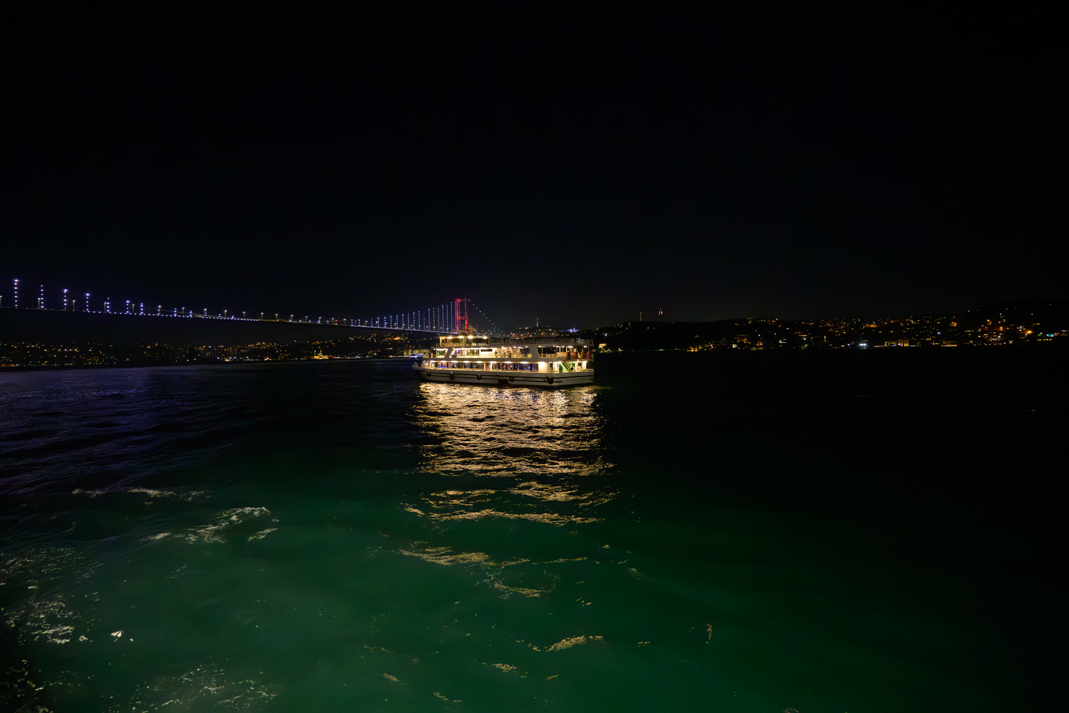 There is a sense of mystery in this photo. Green water, followed by murky dark one and finally a boat full of people, all lit up at night and all against far away shore. Great capture.