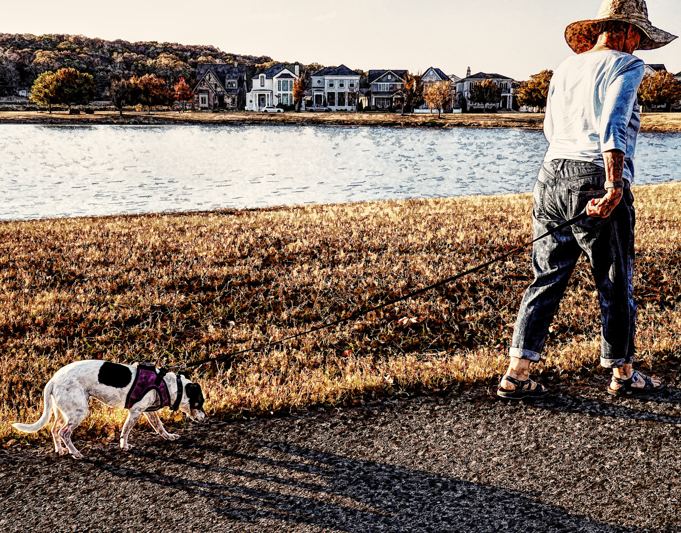 Well titled and fun. Pup seems less invigorated by the shoreline walk than his mistress. The subject becomes the leash that ties them together, bisecting the frame diagonally, and we feel the tension as she urges him along and he hangs back. The textures applied through your processing turn this more towards a Norman Rockwell art piece than a street photo, and makes me like it even more.