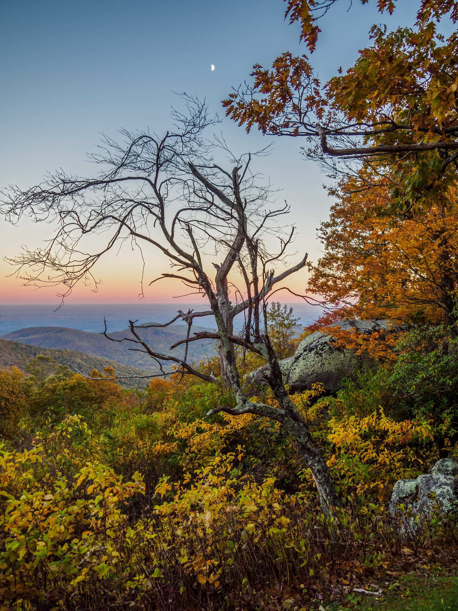 A magical moment, with the half moon, hint of color on the horizon, and lush foliage surrounding the naked tree. That you captured this from the roadside tells me you need not fall down hills or twist your knee in the future in search of exquisite perfection.