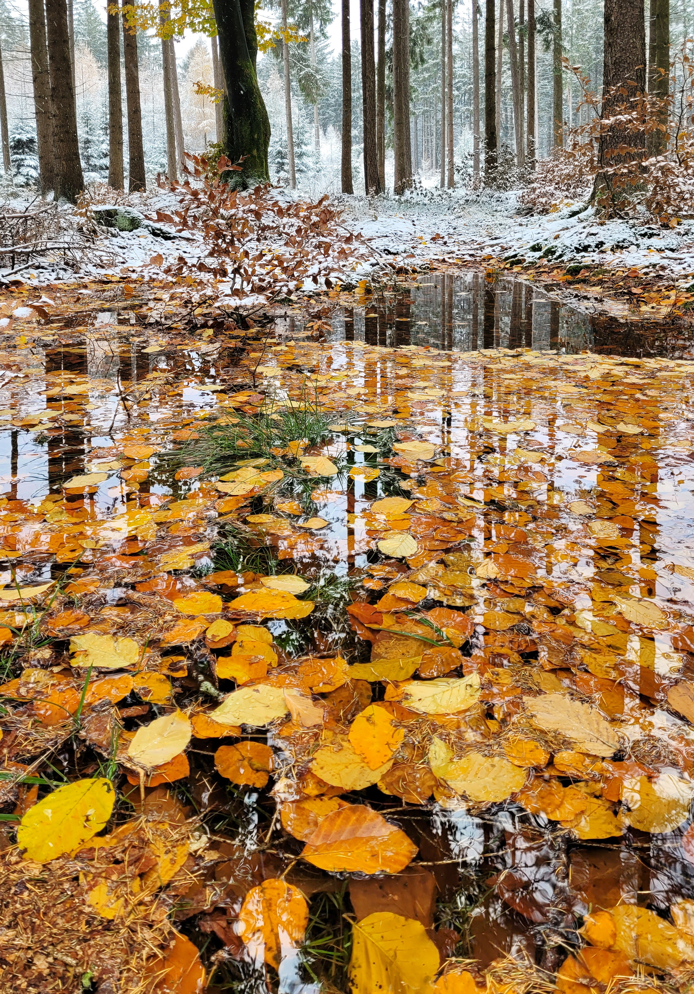 The brilliant white snow accentuates the wonderful array of colors. For a dull overcast day, the colors remain really vibrant. Your pond (it's much better than a puddle 😊) looks like a glass mirror. Phone cameras should be banned... 😉
