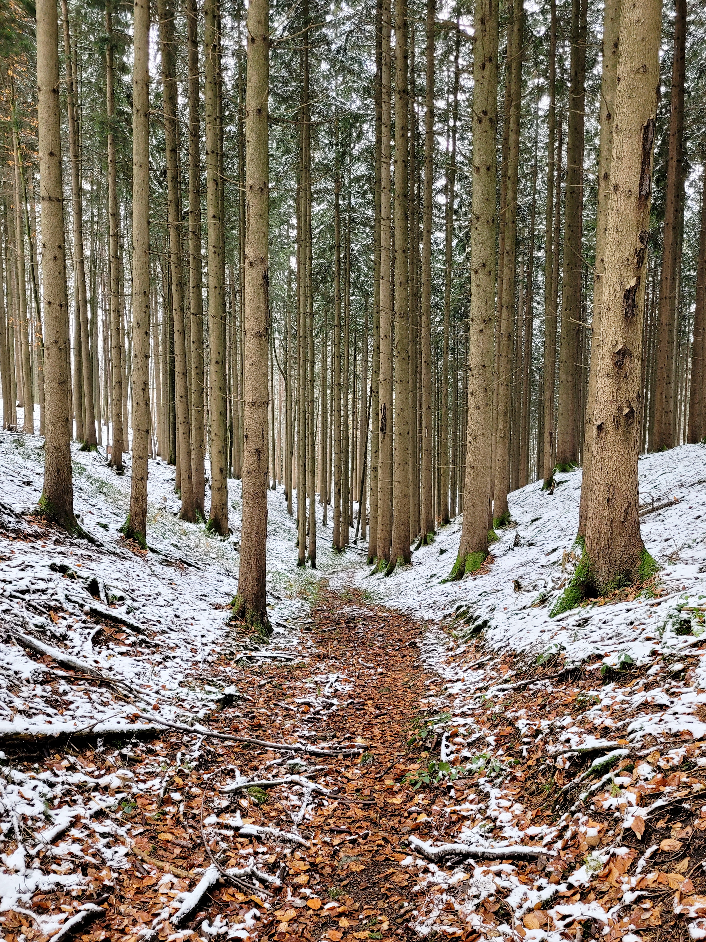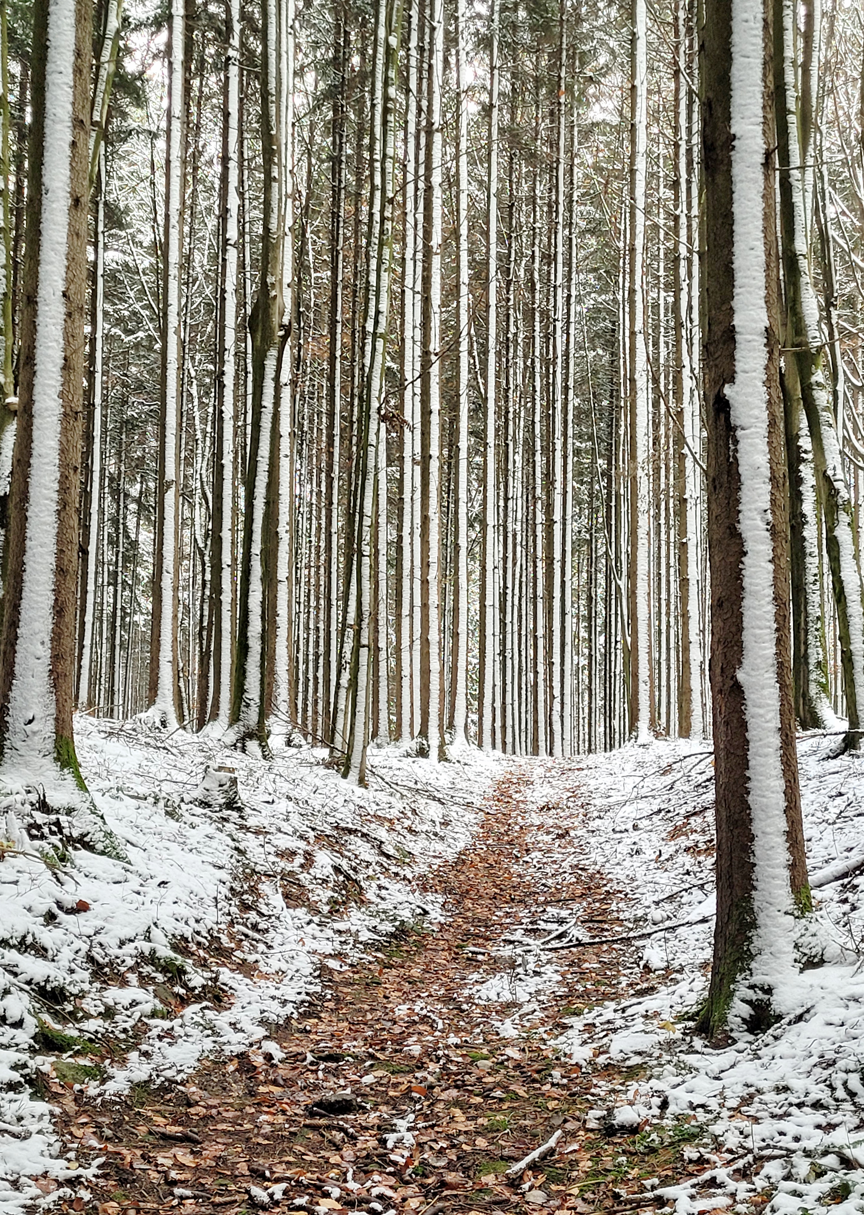 Thankfully, at the beginning of my walk, I’d noticed a thin white line of snow running vertically up each of the pine trees, albeit only on one side.