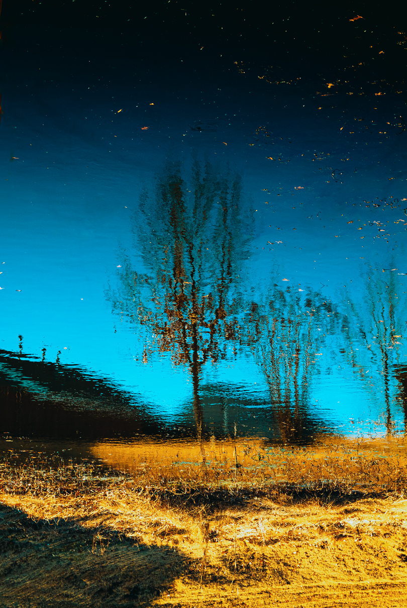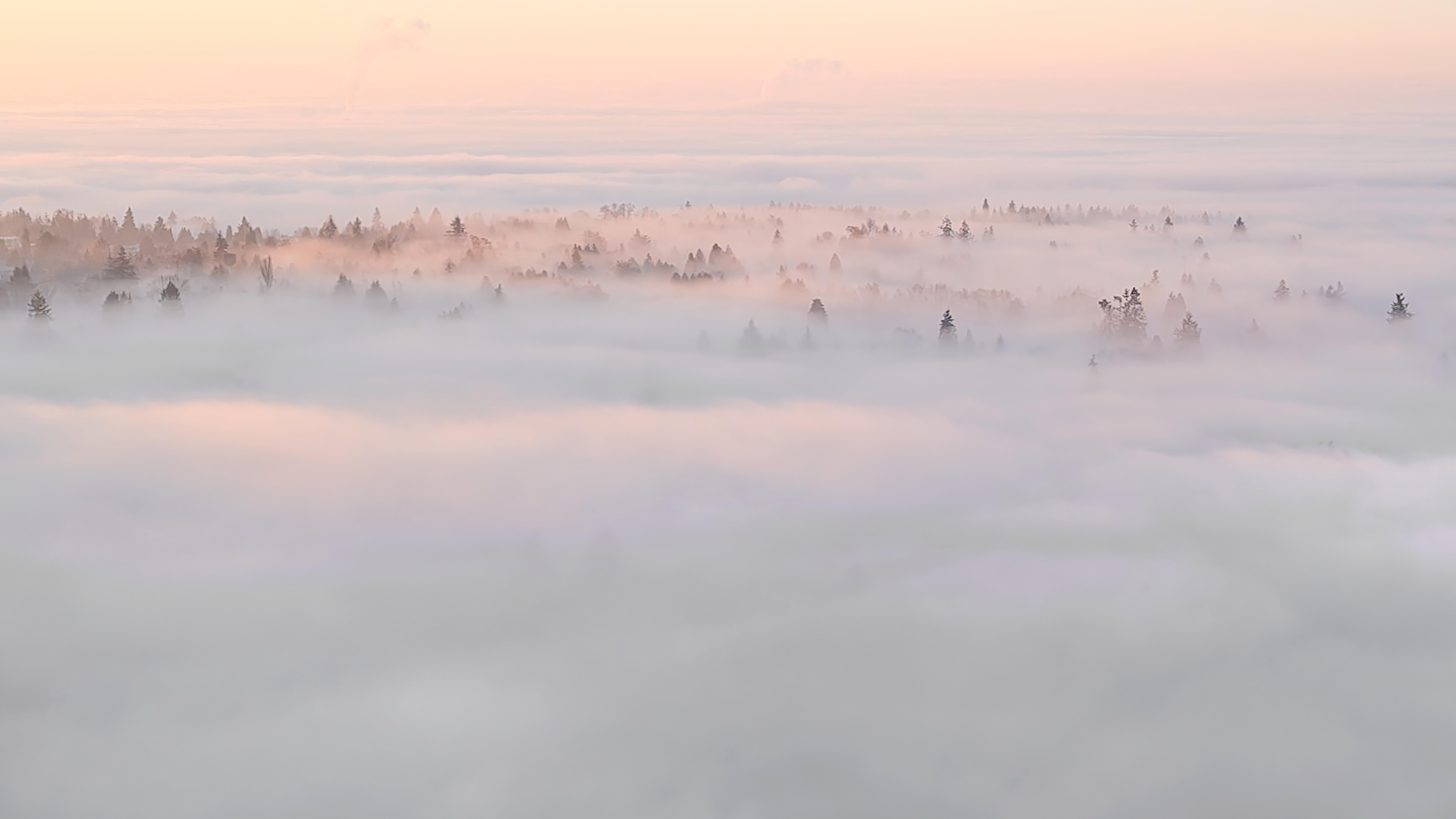 As a viewer, you start by looking at an image that looks like a calm sea, but the realisation quickly sets in that this is not a sea but a sea of clouds, with some trees sticking out of it, lit sideways by gentle and beautifully coloured sunlight.
