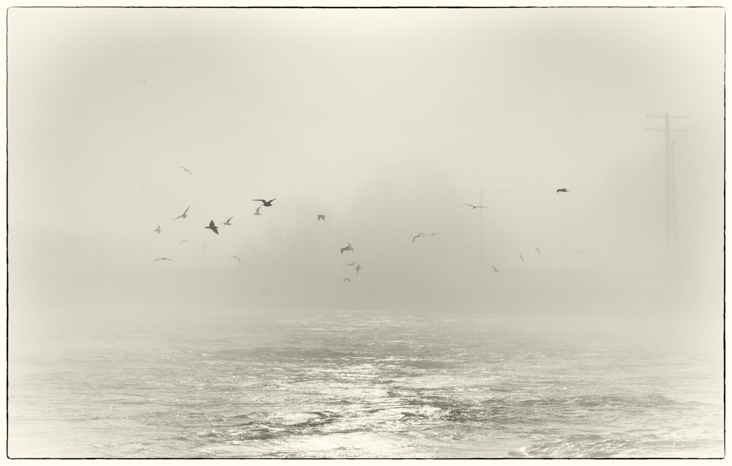 You talk about less is more! The aura of mystery is prevailing with shore in a distance and birds flying in random pattern. Simple and great image.