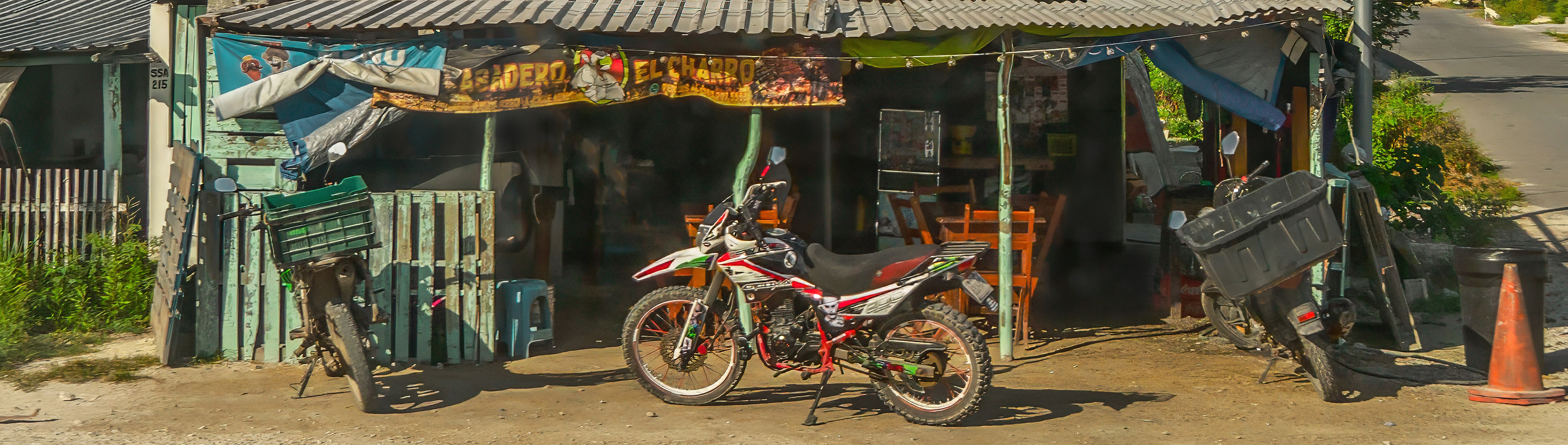 I think there is too much here, with distracting elements. I completely understand that you wanted to get as much of the scene into one image. Yes, that's is extremely tempting. It's very hard to eliminate parts of a great scene. Sometimes it's painful. We never want to throw away anything. I would make this a "panoramic crop" of the bikes and shop.