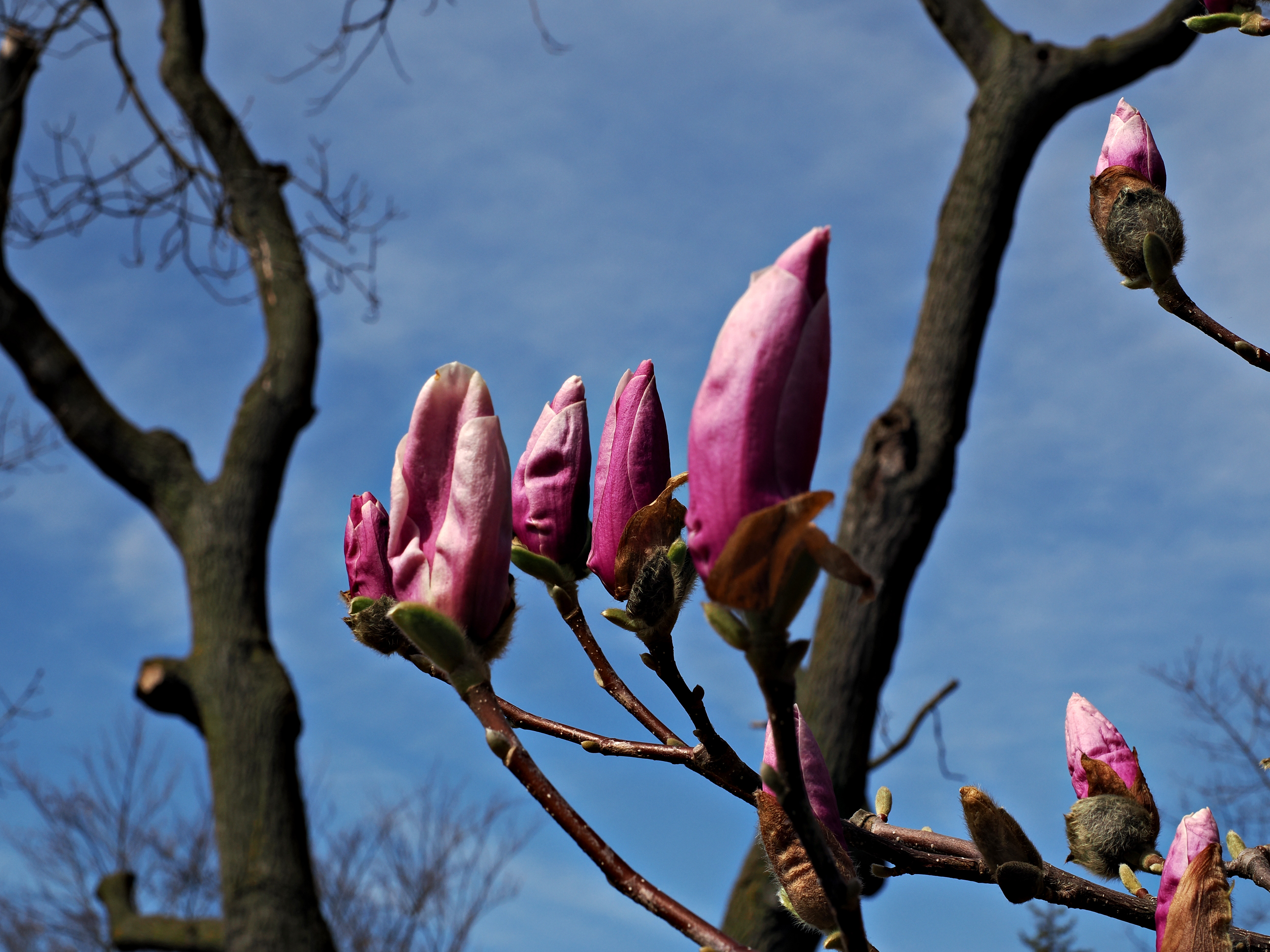 I like the buds framed by the out of focus bare trees. I also like the fact that the left hand buds are a wrinkly! If the had all been perfectly formed, like the bud in the centre, it would not have been so interesting!