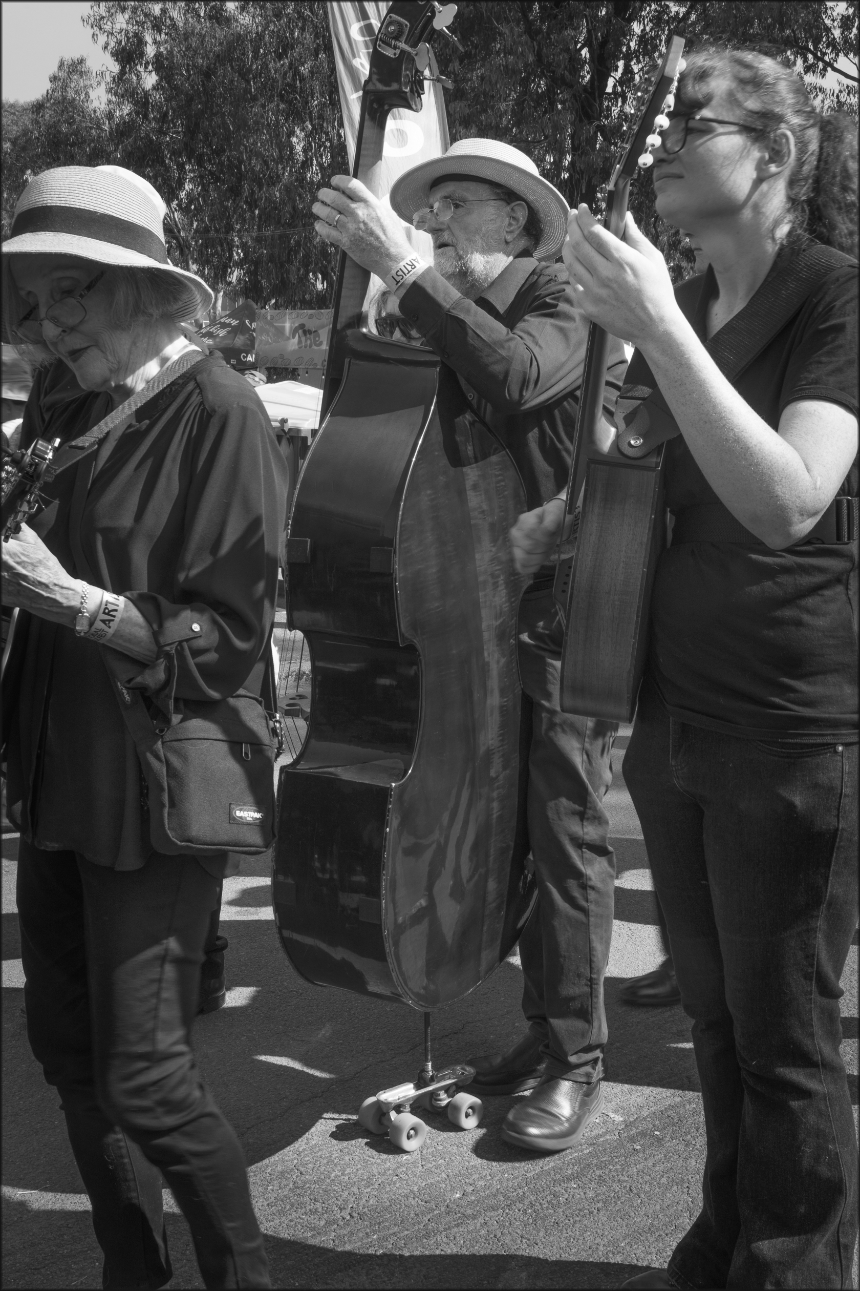 I also think the tight crop cutting into the two women is pretty severe and sends a signal that they, and the group as a whole, are not really the subject. They funnel our attention towards the man, his fine bass and, most importantly, the roller-skate support, which is very amusing and no doubt the improvisation referred to in the title.