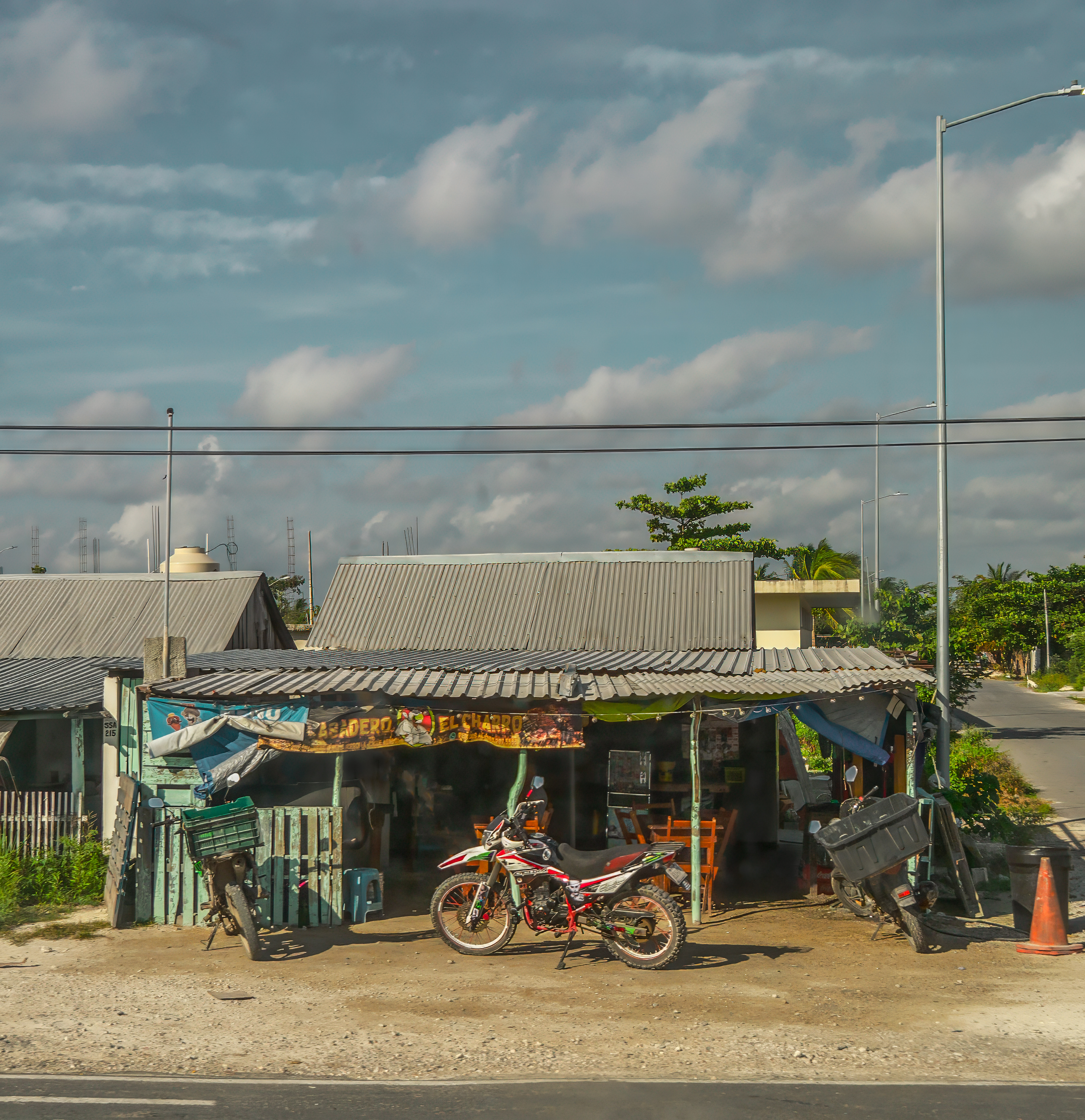 I agree that the original has plenty to see, causing the eye to wander. However, the different elements of the paved and unpaved road, the building, the vehicles, the tropical trees, the construction work and the lovely sky, are all interesting enough in themselves, eaching adding a further facette to the picture, that I don't feel distracted, just invited to explore. Even the cables and posts running through the frame tell the viewer about the type of place, and form a frame of sorts at the same time.
