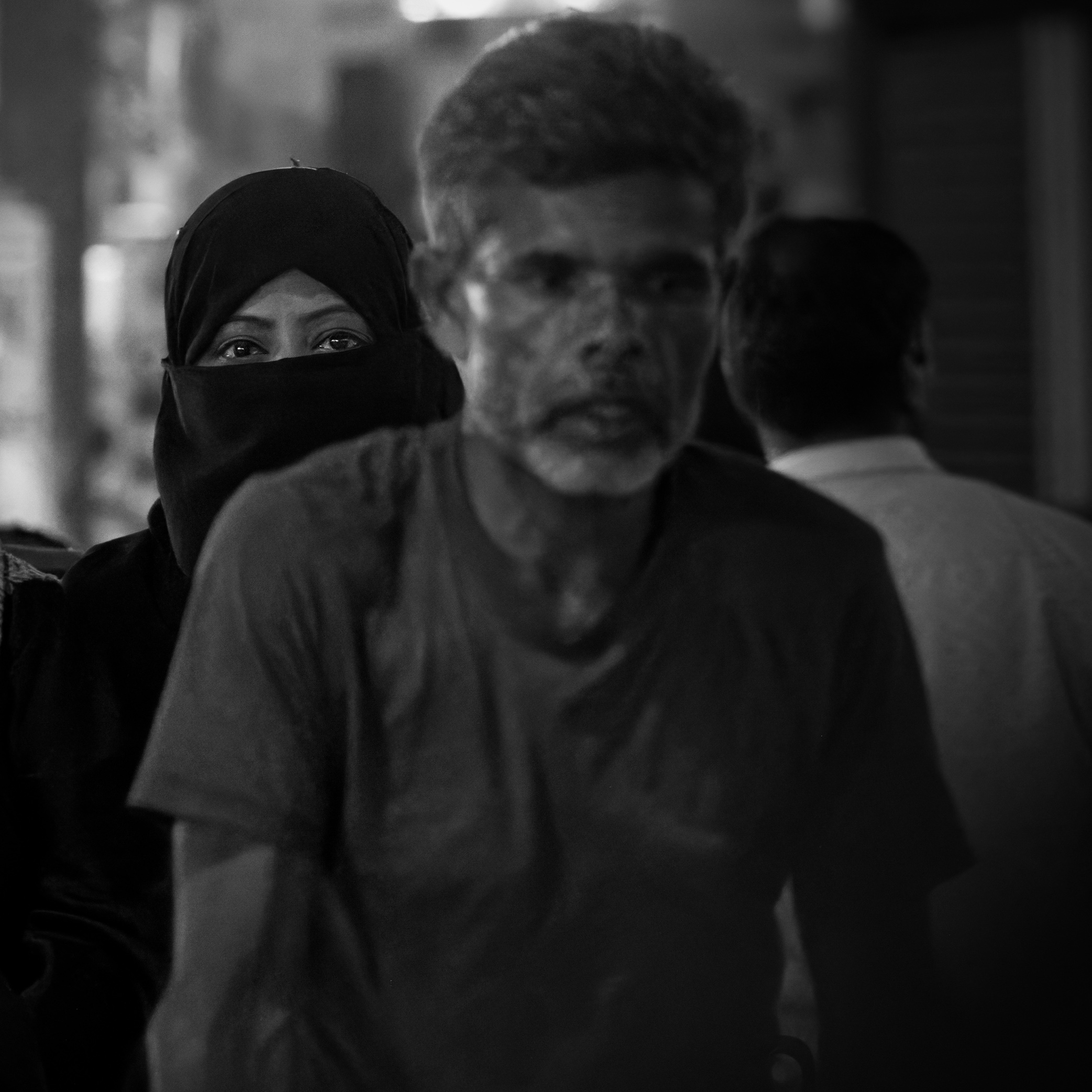 Good titling helps secure a viewer's understanding of the photographer's intent. The man we are facing, who takes up half the frame, is not the subject, but instead is context for the real subject, who peeps at us from behind her extensive coverings as she walked unseen by men who are in modern dress. There is a depth of emotion in those eyes but it's hard to read. Thought provoking shot.