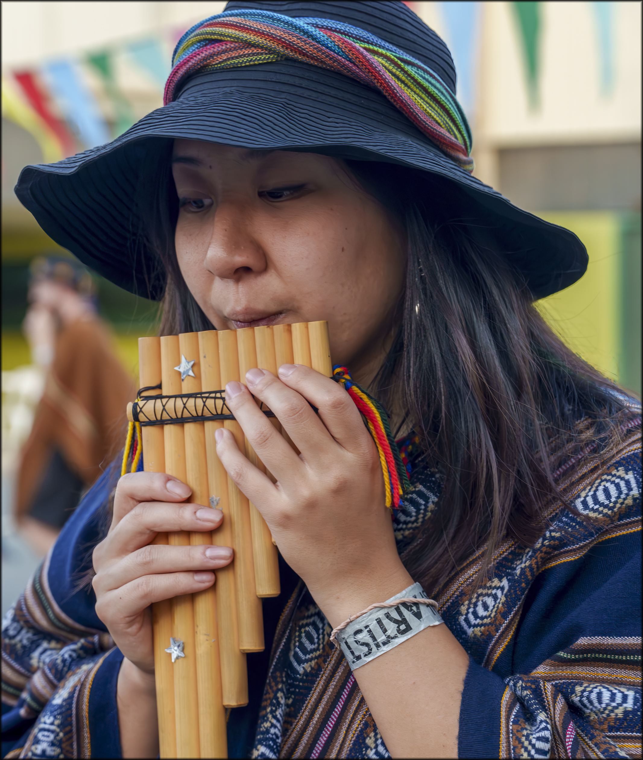 I love pan pipe music, so it's interesting to see a close up image of a musician playing one. Looks like she's wearing traditional clothing as well. You chose a nice angle, got lighting and focus just right. Nicely done.