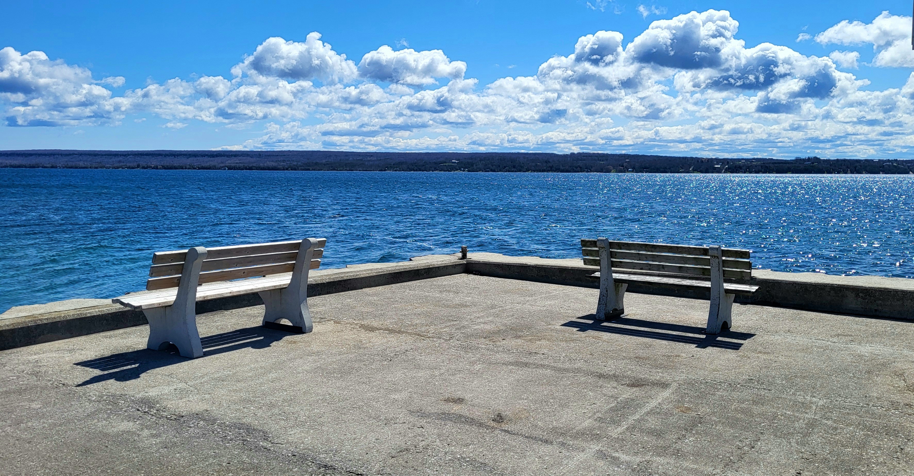 The arrow of the quay points across the water to the low shore and the attractive sky. The benches look as though they are no longer talking to each other, but they balance the composition and, by facing across the water as well, invite the viwer to do the same.
