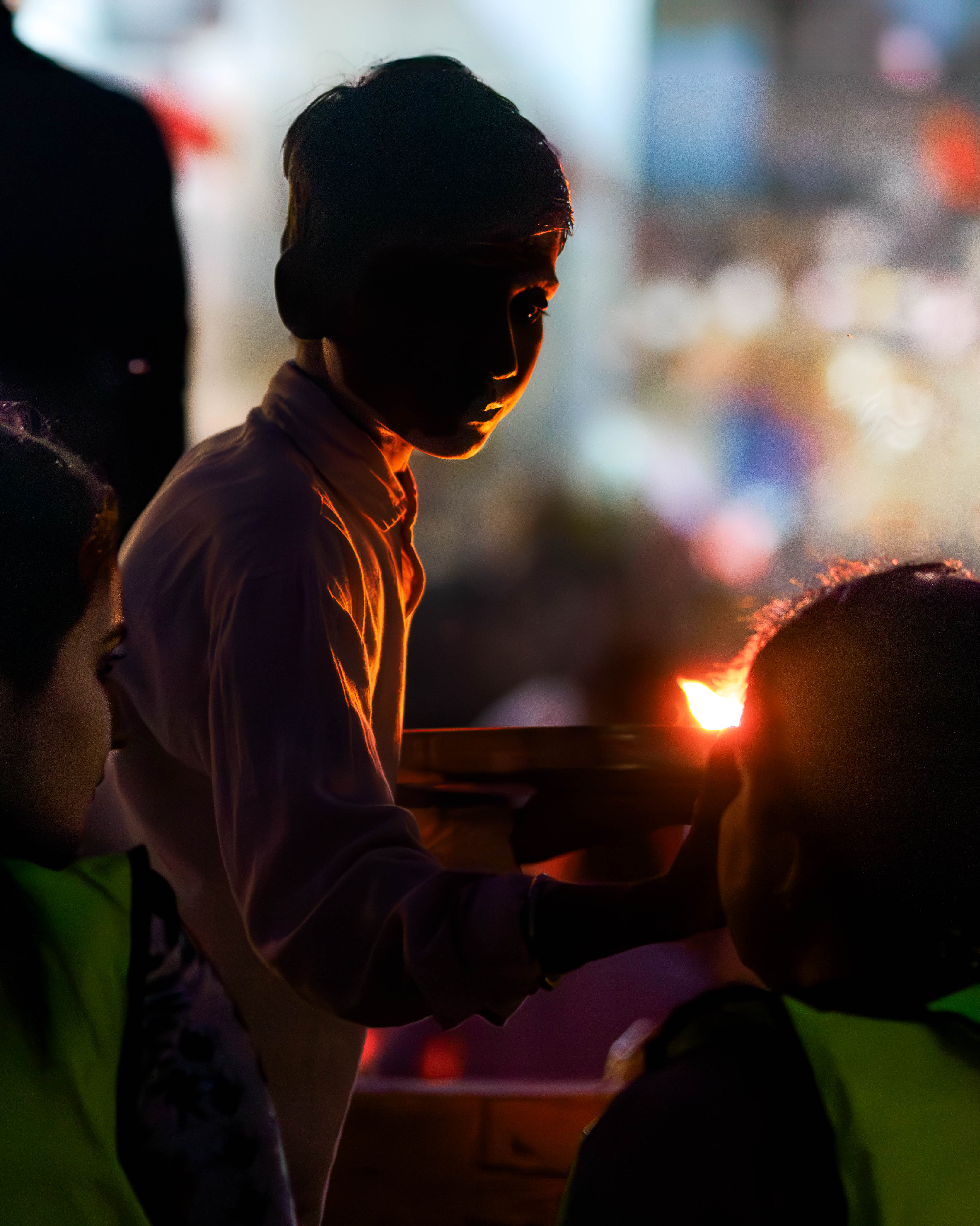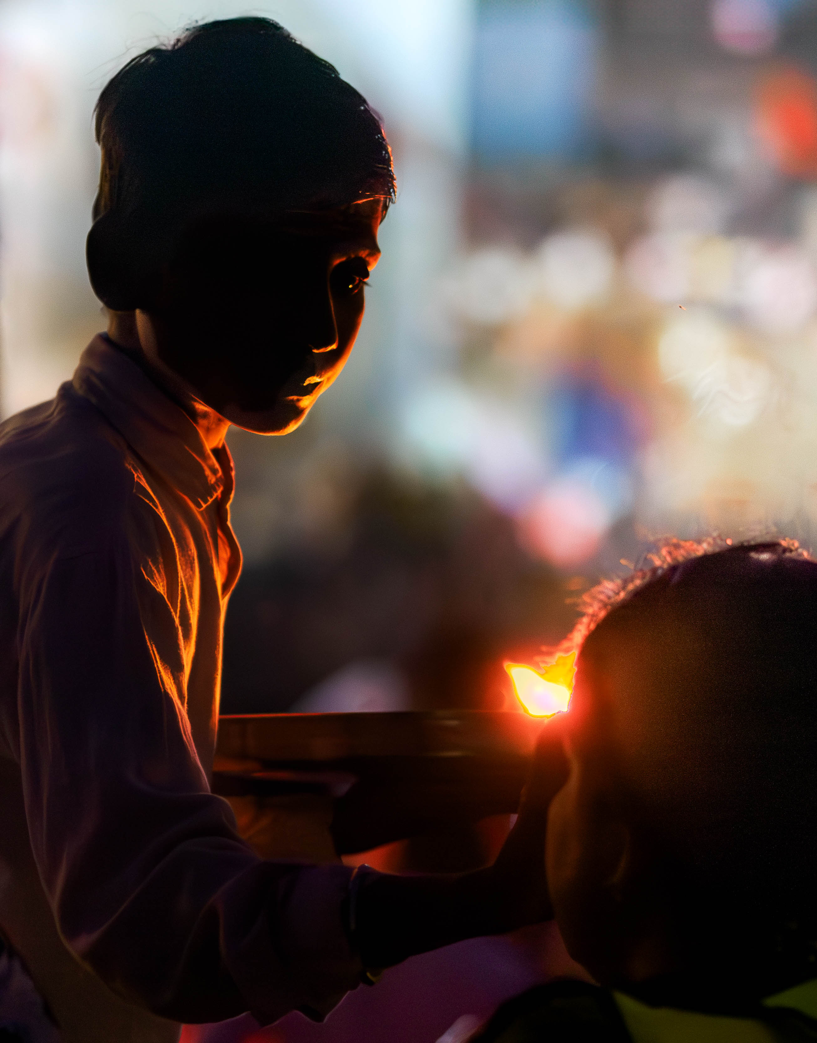 But now my responses are all over the place and I like different things in the two versions. I could make a case for the more inclusive second version with the extra space at the top and the girl on the left watching. I could also make a case for the original tight crop at the top and a much tighter crop down the left to a little behind the boy's head while losing the girl on the left completely and keeping the raised shadow detail of the figure on the right. This version would increase the intensity and intimacy of the tika contact between the boy and the devotee. In both cases, I'd have a go at reducing the highlight of the flame a little.