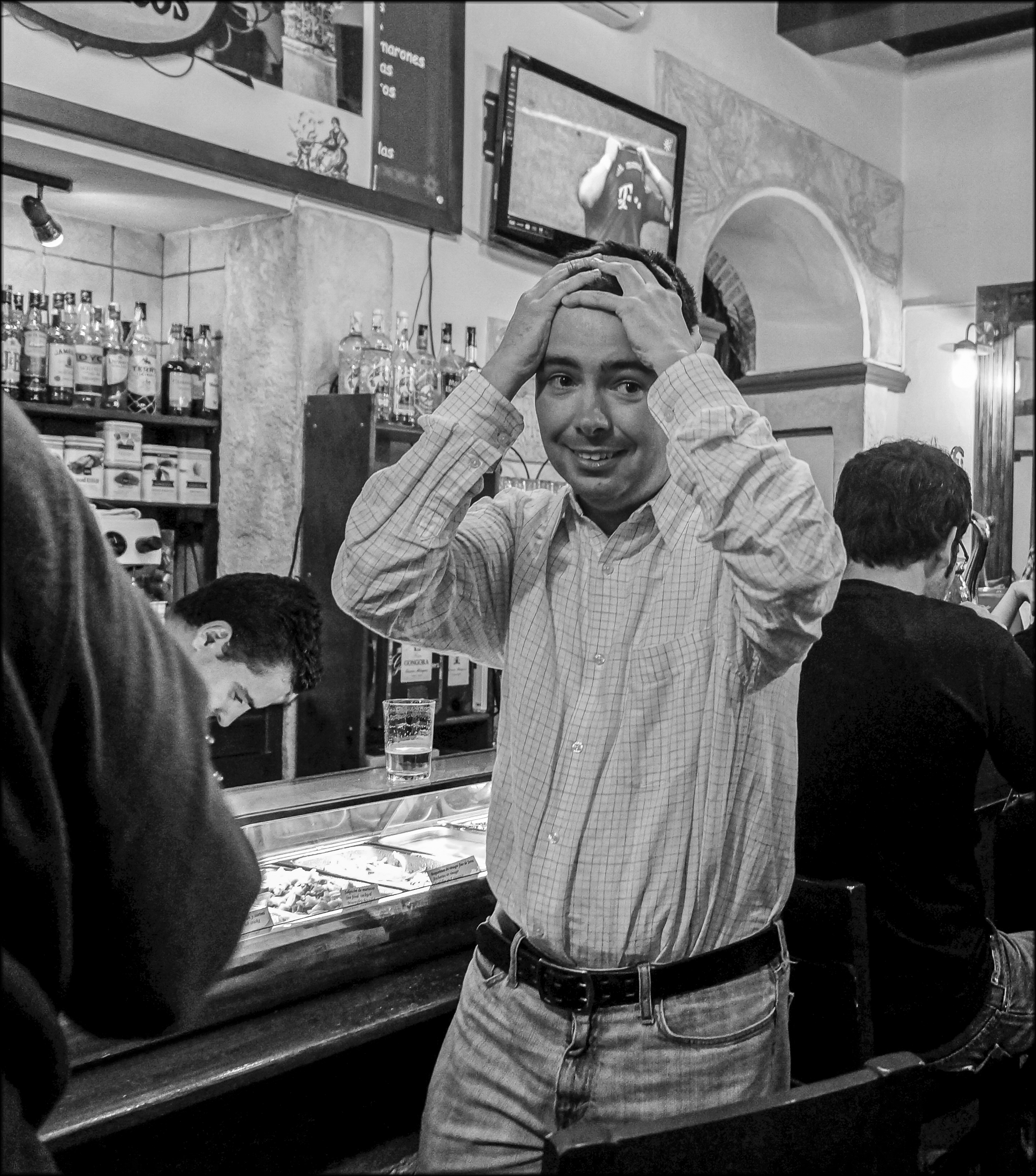 How the soccer fan is subconsciously echoing the gestures of his heroes visible on the TV screen is just beyond magnificent.
