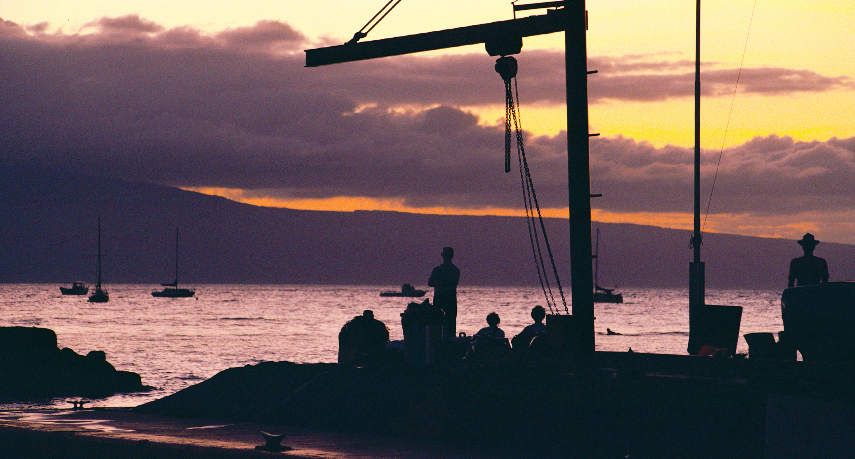Lahaina, Maui, HI, from the wharf in front of the Pioneer Inn and the Banyan tree looking toward Lanai in much happier times, long before the fire.