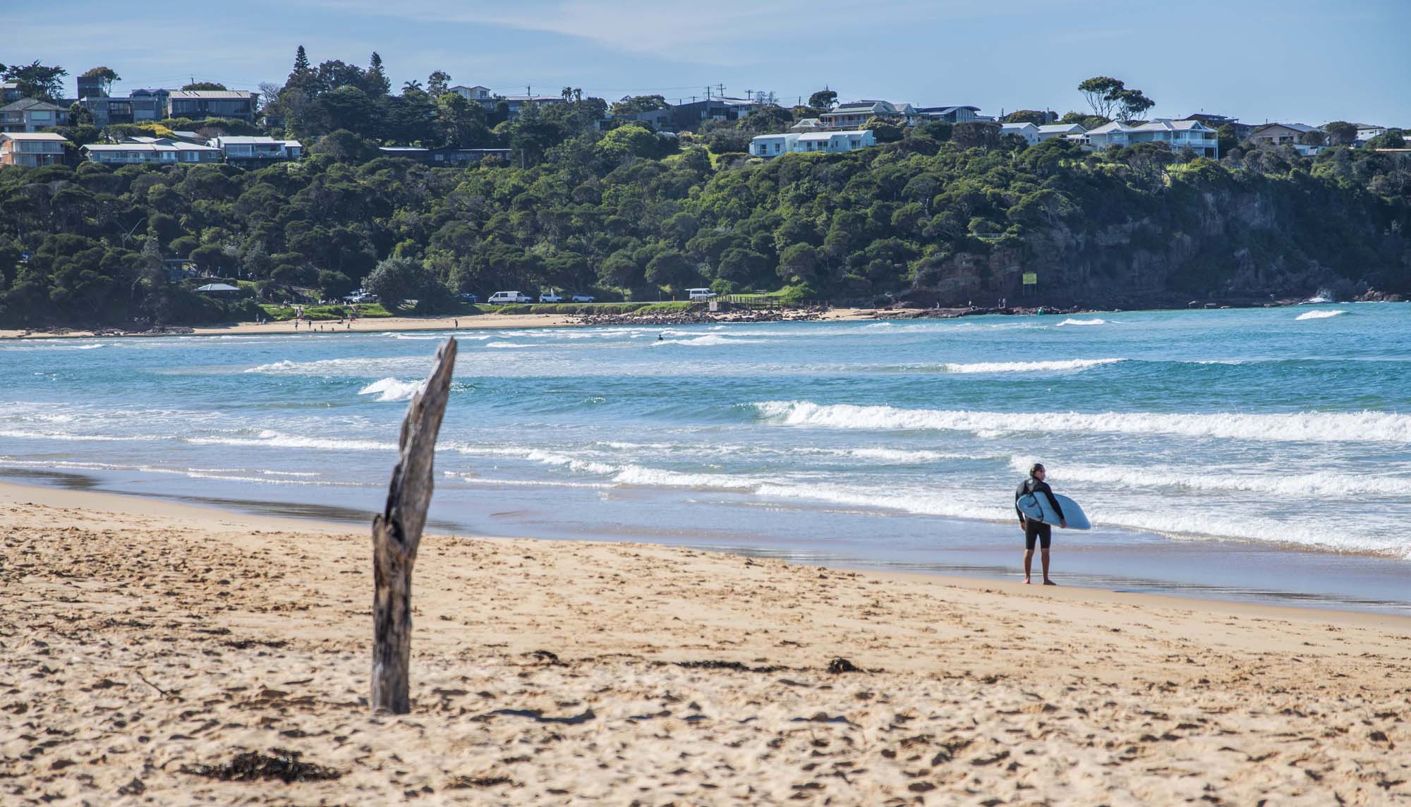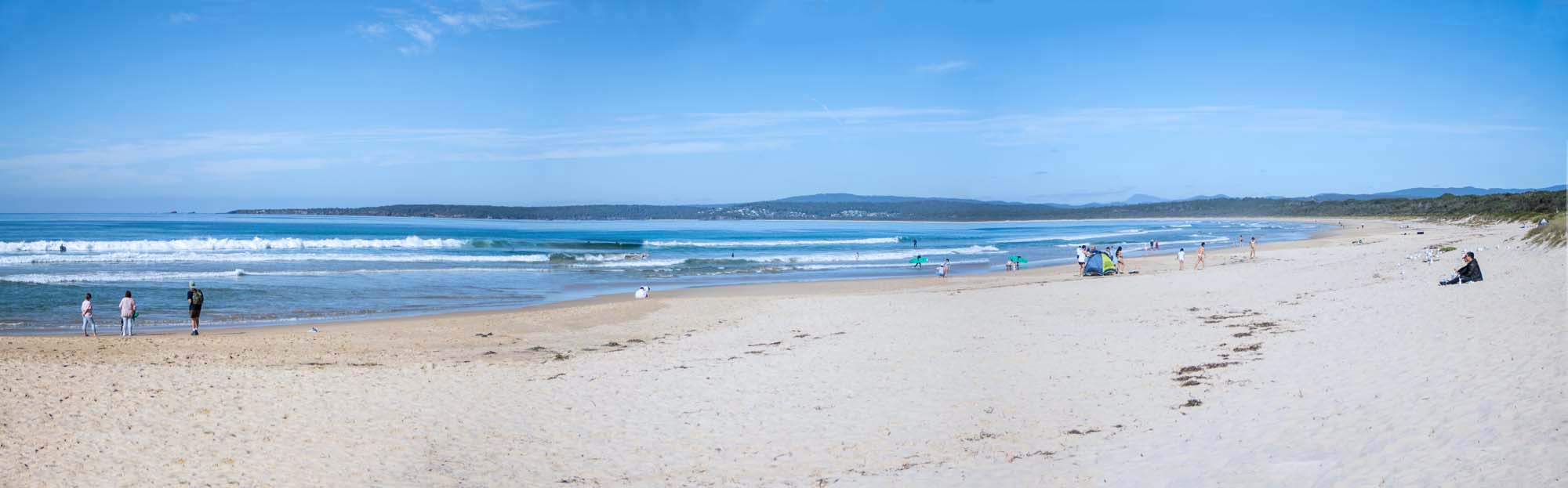 This is a Photoshop Elements stitched panorama of Merimbula Beach, mid Autumn (about 20C). Merimbula is a very popular town/village (especially during the summer months) on the New South Wales coast, Australia.