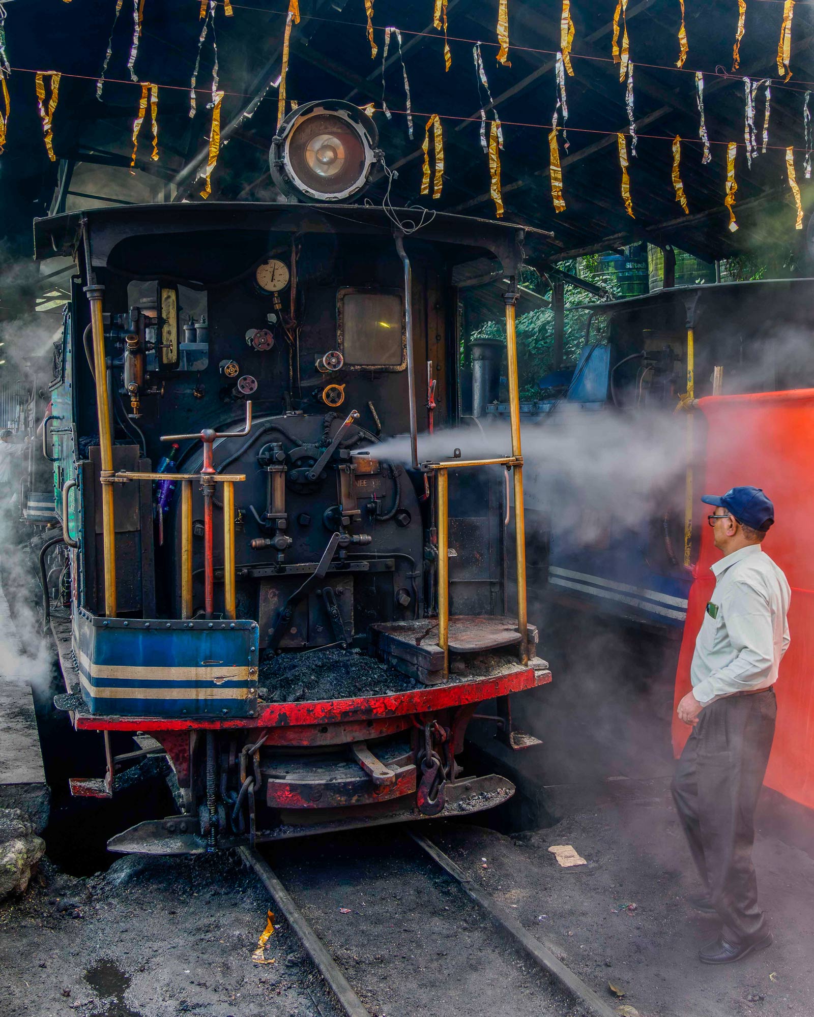 The golden dangling down thingies add pleasing complexity and depth to the brass railingsaround the driver's platform. The spurt of steam that unites man and machine couldn't be more appropriate. Perfectly caught.