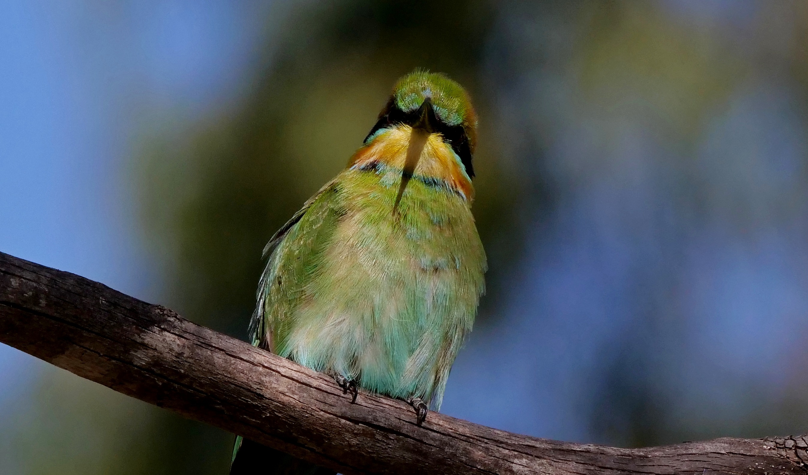 Another pretty shot of a bird I shall never meet, with a rainbow of natural coloring that boggles the mind. I do like the unusual effect of the shadow of his beak and the quizzical posture. I think some brightening would help combat the effects of the contrasty lighting, add some facial detail and clarify the wonderful colors - maybe raising shadows and overall brightness or maybe even some selective brightening around his mask too. You are becoming a bird whisperer!