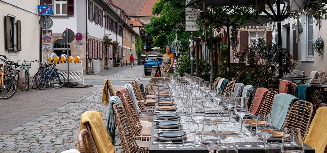 Now the photo. The lead in time for a big event must be tense for a restaurant. It shows here. There is a sense of the scale. Everything is set up. There is just enough detail to interpret the woman as a waitress making a small adjustment. Visually I like the harmony between the road surface and the table tops. Together they produce converging lines that accentuate the scale of the event. Kumsal's angle picks up the careful placement of the table settings, glasses and chairs. The perfection creates a certain tension. We know the perfection wont last and soon there will be intense activity.