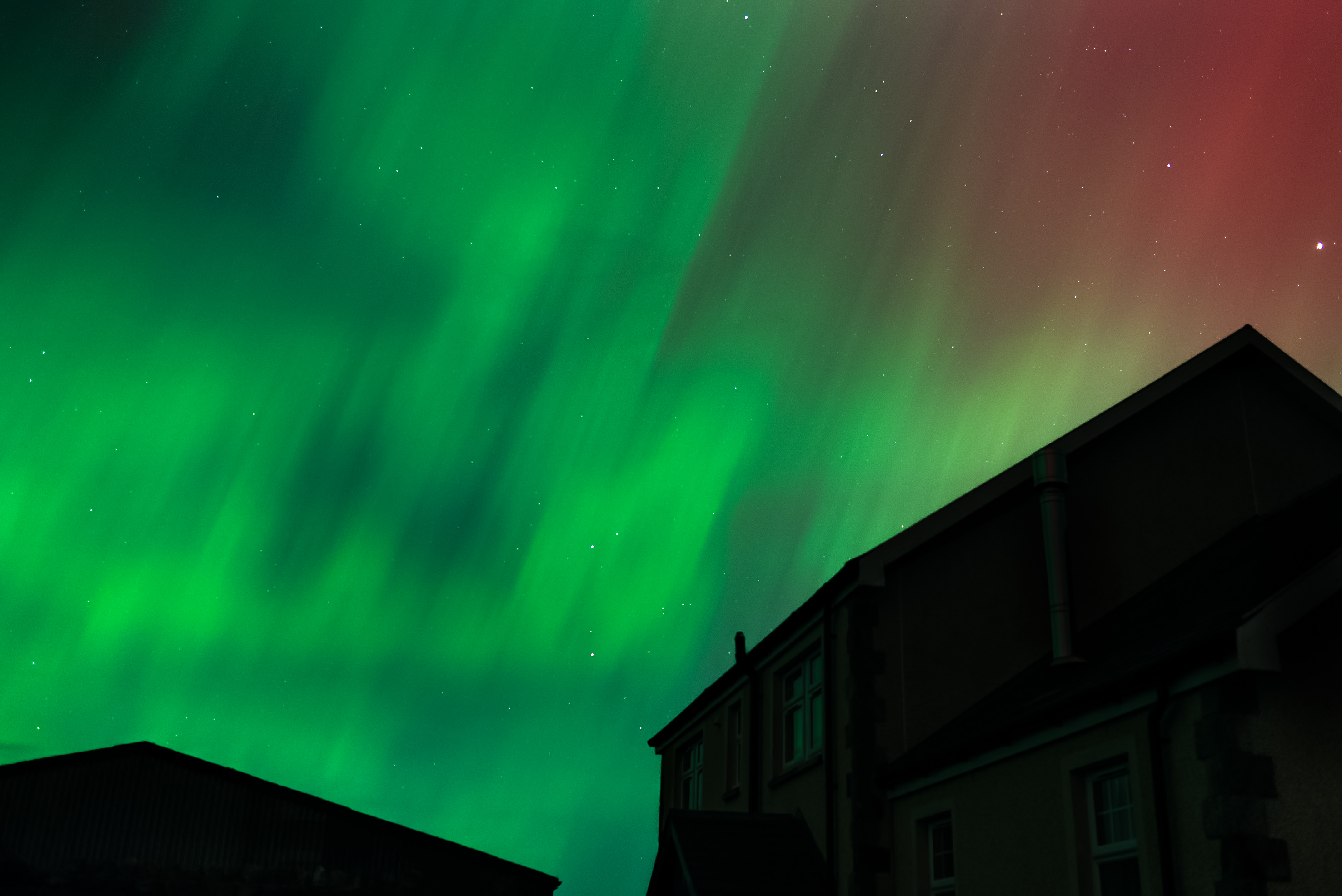 Oh I am so jealous of you capturing such a thing as this! Where I am there was a slight magenta tinge to the sky and some people had success making more of it with long exposure shots. But this! Better than any fireworks display, absolutely gorgeous. I don't know that any editing is needed, though the building parts seem ripe for either darkening or cropping so we're not distracted by gutters and such that don't quite fit the degree of magic involved here. So beautiful I can taste them. Thanks for sharing.