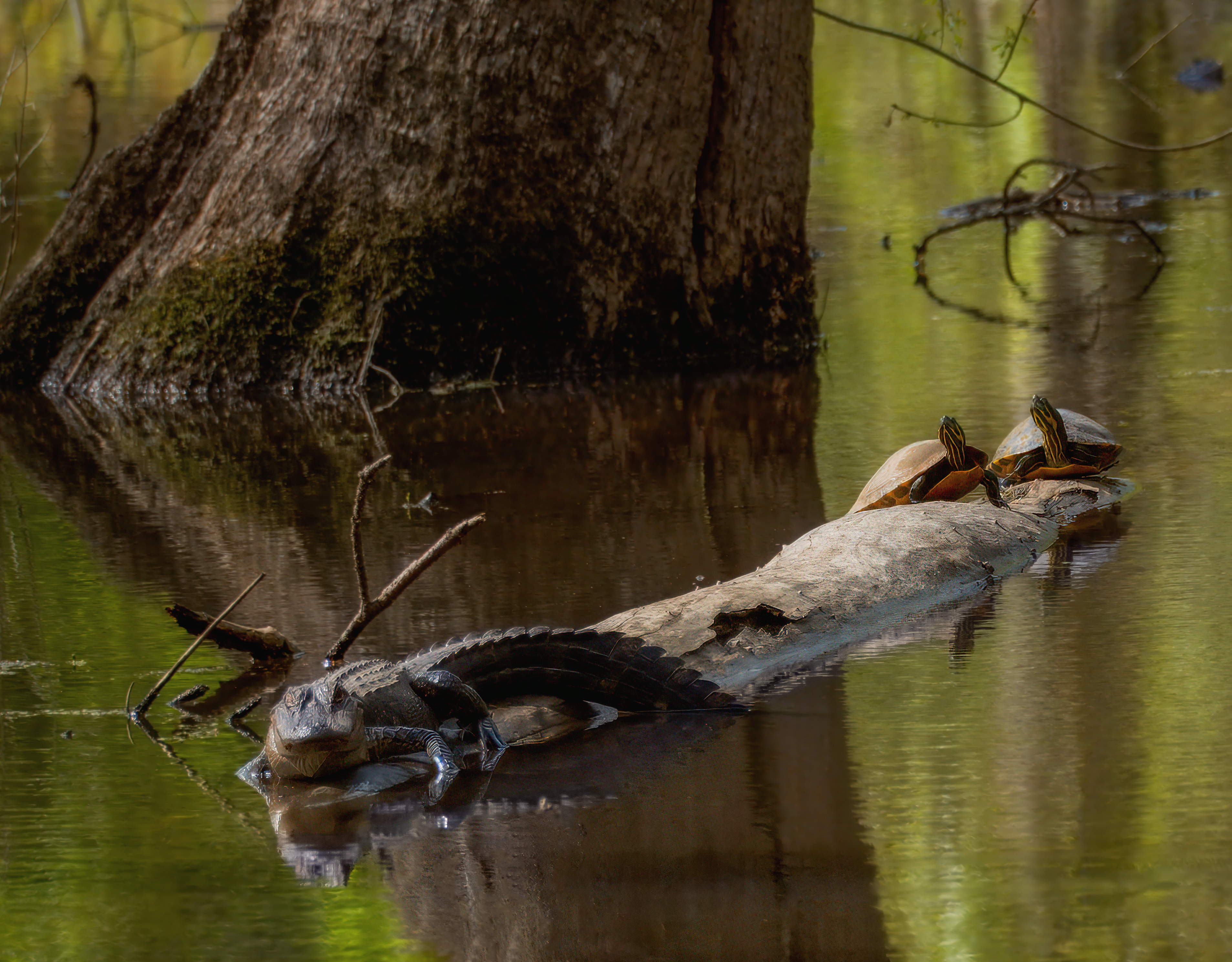 Thank you. The swamp is richly colored in spring and summer, and that is the only time we see the swamp creatures out and about. If you look closely you'll spot another alligator in the background on the right. There were about a half dozen there the day I took this one.