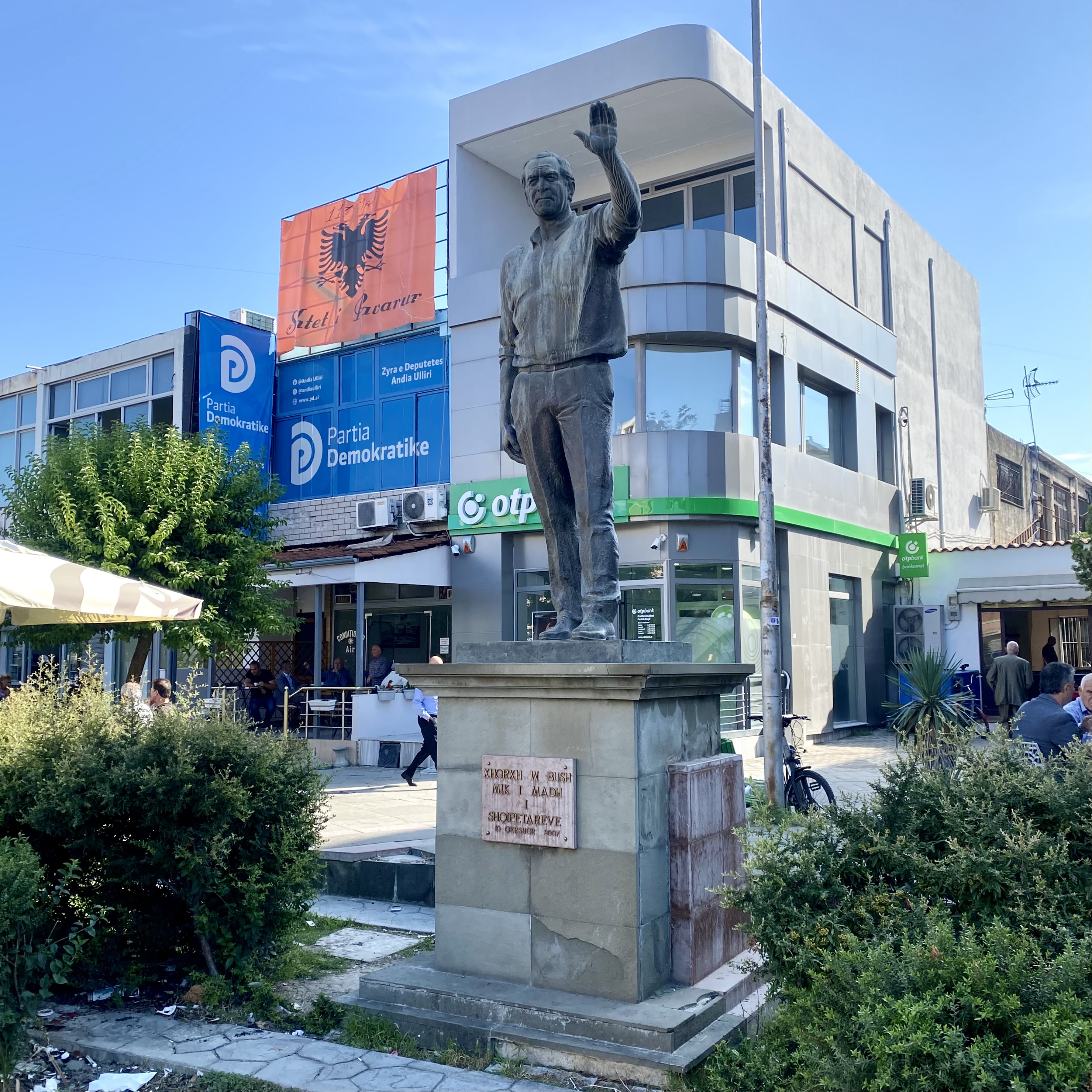 Obviously, as we headed back south to start our Albanian adventure proper with a drive past Tirana and Elbasan to Lake Ohrid on the North-Macedonian border, I just HAD to go find that statue. It stands proudly on the center of a Y-shaped and very busy intersection in the business/commercial part of the town.