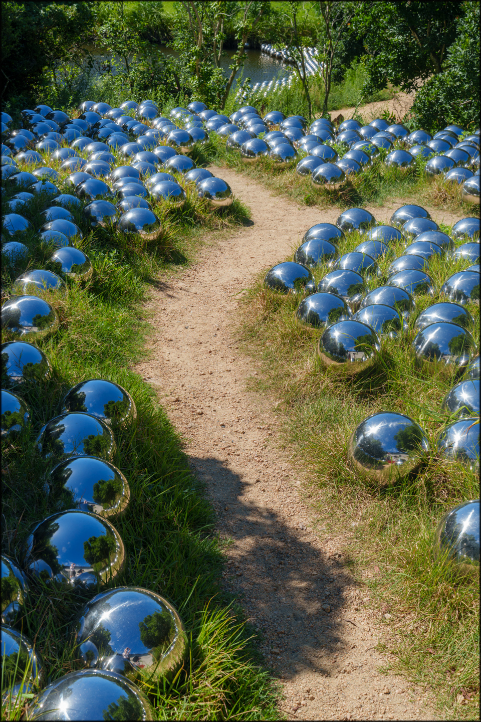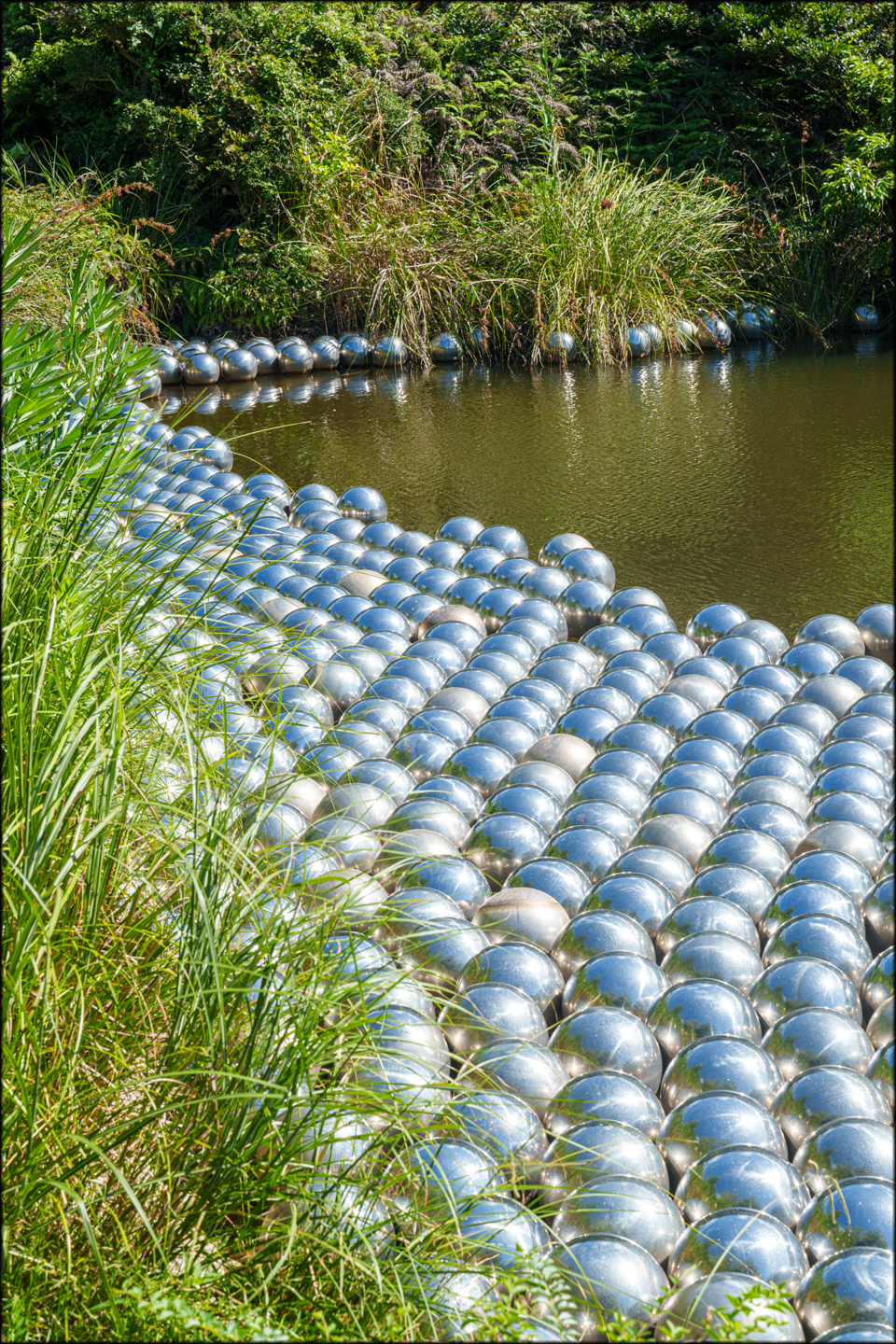 I’ll attach a couple more photos taken outside. Across the whole installation, which is huge, there are many hundreds, probably thousands. Of highly polished silver balls about 20cm across. Looking at the installation, you are confronted with yourself  from many different angles and in different settings.  The balls move and can float. Those on the Lake are moved by the wind. They form clumps and sound like they are talking as they bump together.