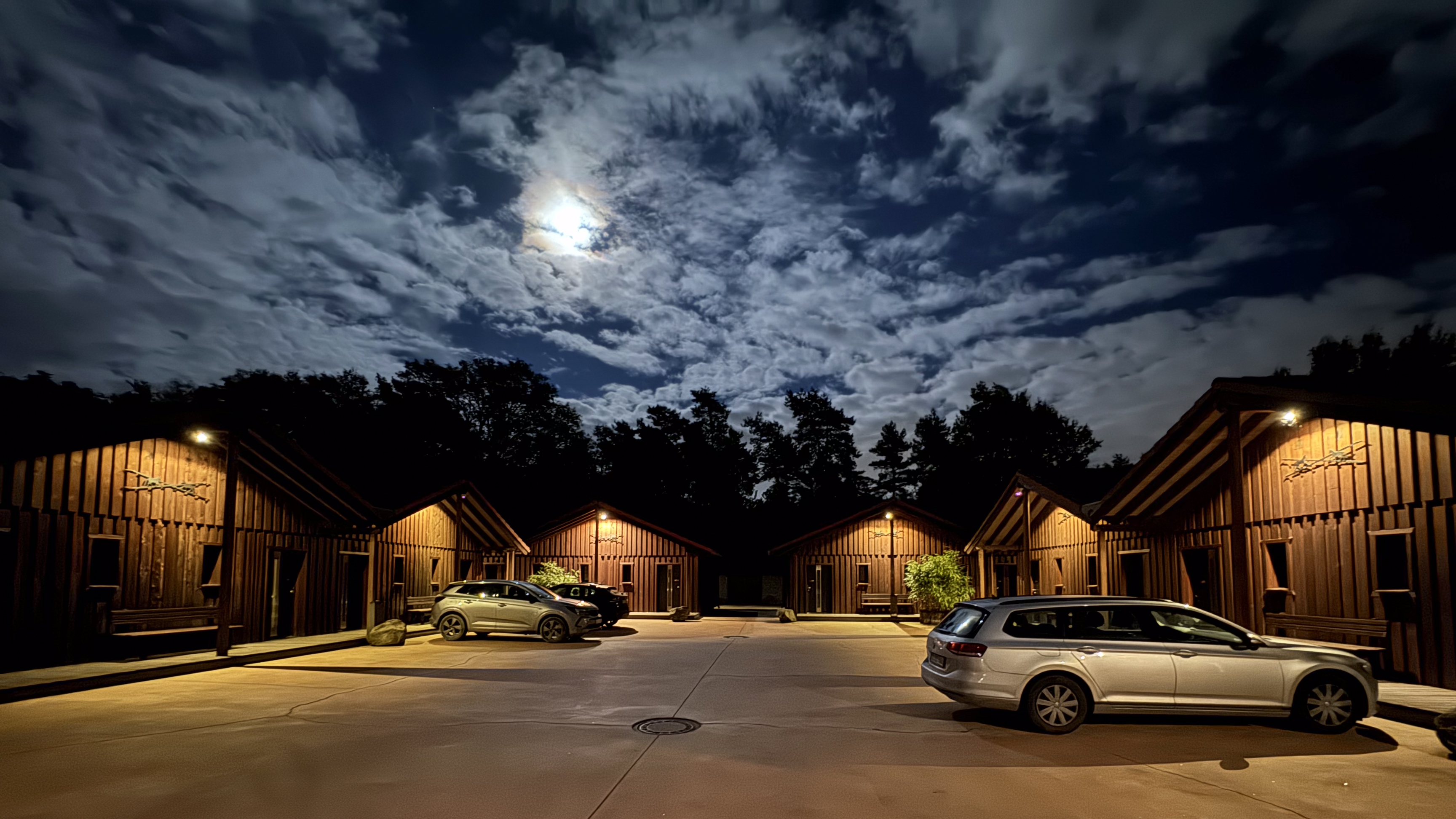 An interesting and creative photo. I'm not usually a fan of perspective distortion but it works for this photo. The complementary colors of orange/blue enrich the image and cause me to examine all the details which are considerable. There is a clear compositional line from the moon through the vanishing point between the two middle structures and on to the back of the station wagon. The motel seems like a setting for a horror movie. It is a little quirky but it is an image that sticks to me. Well spotted and captured.