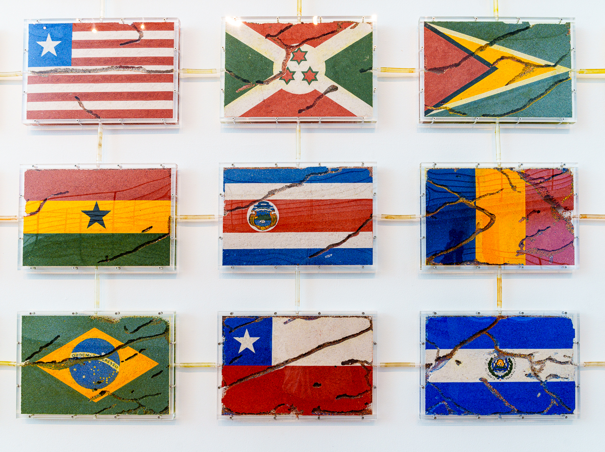 Lots of 3d perspex boxes. Each box contains the flag of a country and the flag is made from coloured sands and grains.