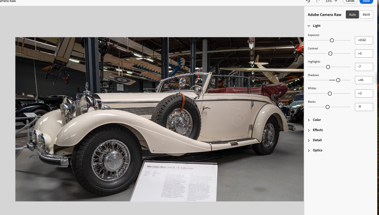 Thanks minniev. That's what I was seeing on my histogram too when I double checked in case my monitor screen really was out. The Ai version is almost what I imagine is the way our eyes would have seen the car if we had been there. Especially I think we'd have been attracted to the chromework on details such as the wheels.